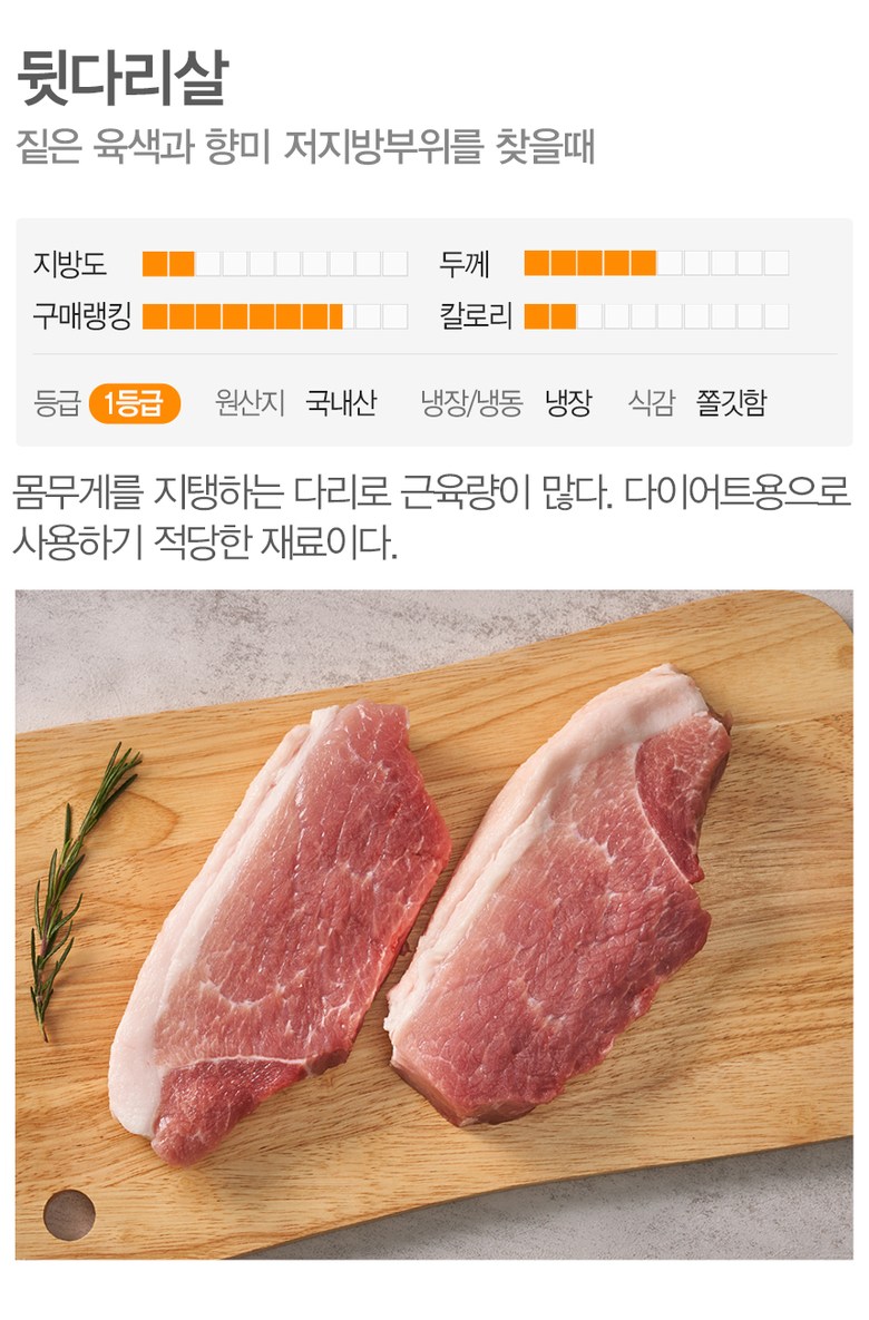 | 품목 또는 명칭 | 미트스튜디오 한돈 냉장/ 냉동 뒷다리살 2kg | 포장단위별 내용물의 용량(중량),수량,크기 | 500g x 4 팩 |