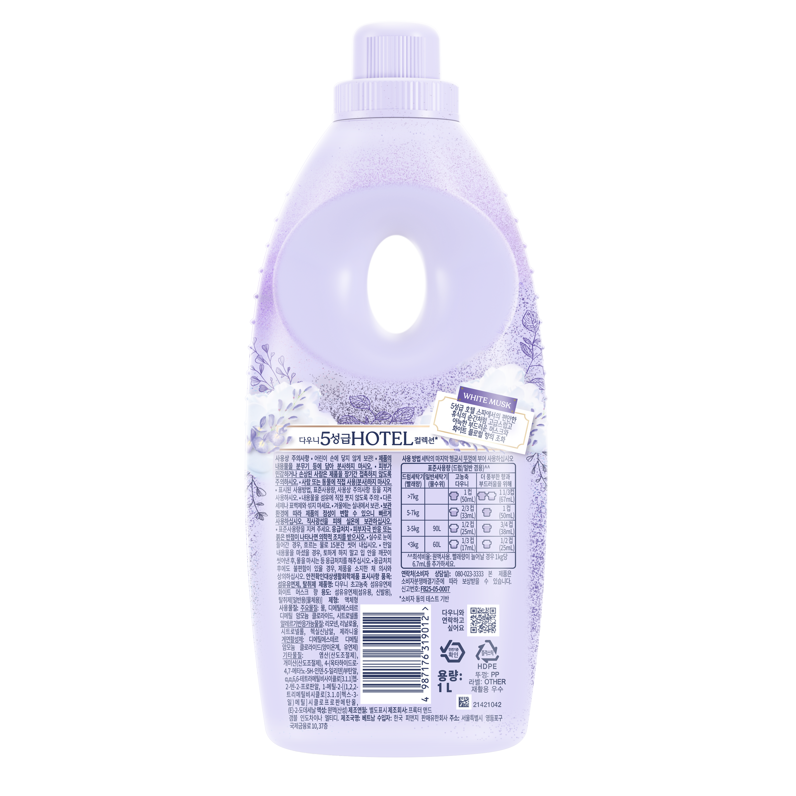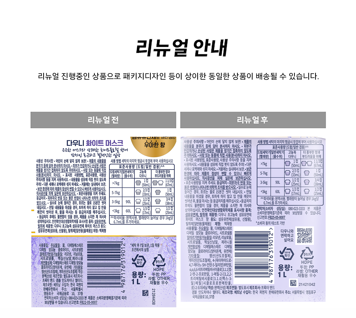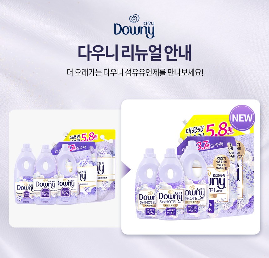| 품목 및 제품명 | 리뉴얼전: 섬유유연제, 탈취제 / 다우니 초고농축 섬유유연제 화이트 머스크 | 리뉴얼후: 섬유유연제, 탈취제 / 다우니 초고농축 섬유유연제 화이트 머스크 향 | 용도(표백제의 경우 계열을 함께표시) 및 제형 | 섬유유연제(섬유용, 신발용), 탈취제[(일반용(물체용)] / 액체형 |