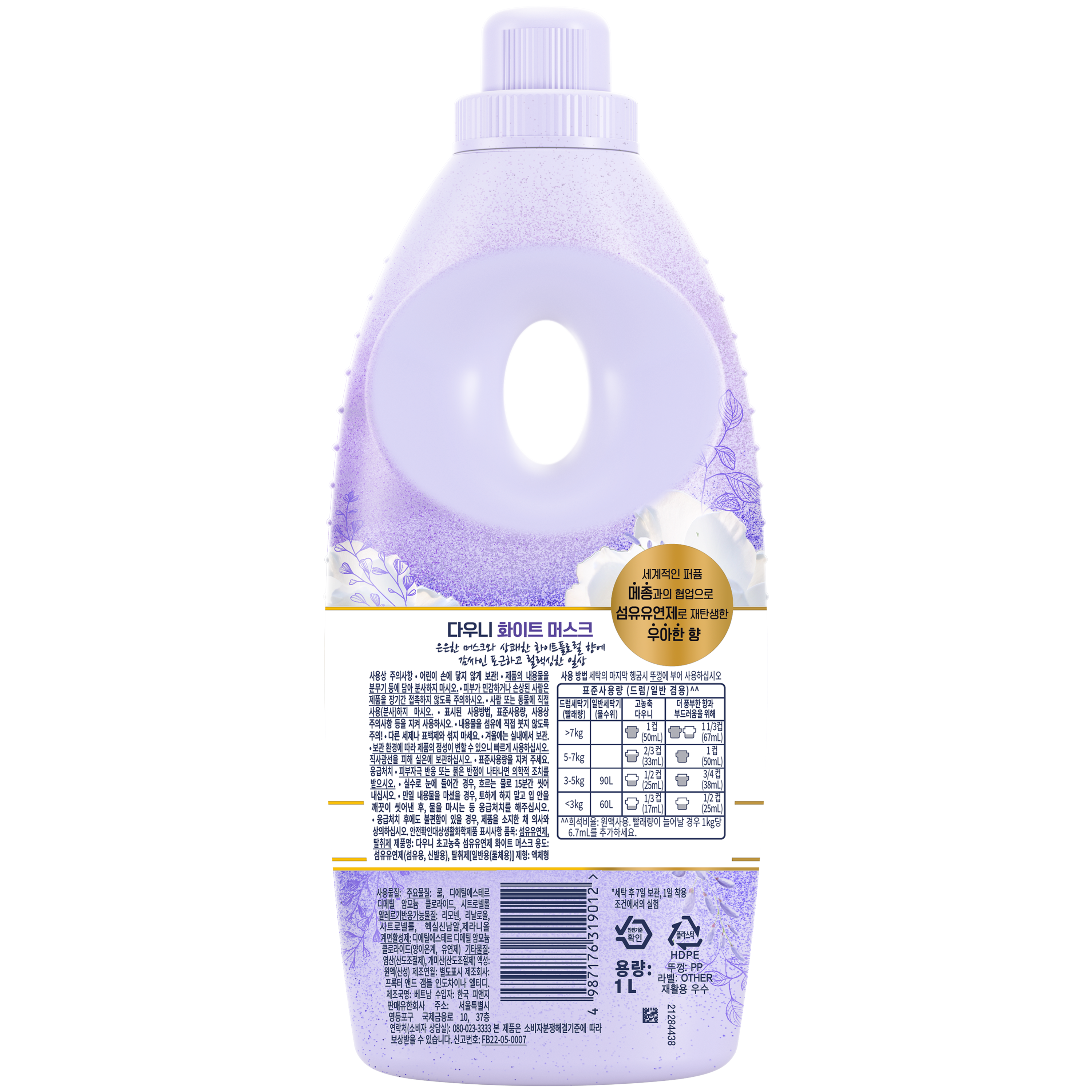 | 품목 및 제품명 | 섬유유연제, 탈취제 / 다우니 초고농축 섬유유연제 화이트 머스크 | 용도(표백제의 경우 계열을 함께표시) 및 제형 | 섬유유연제(섬유용, 신발용), 탈취제[(일반용(물체용)] / 액체형 |