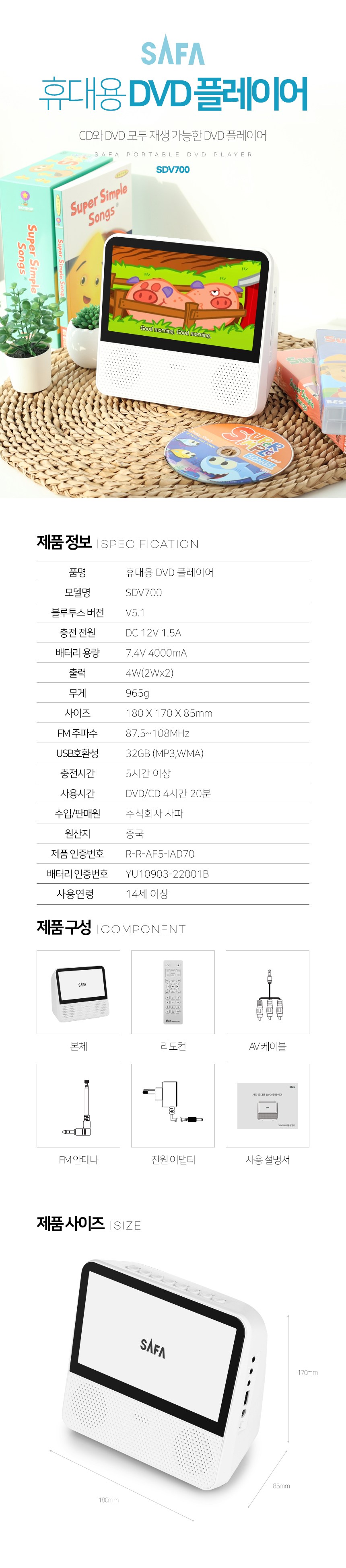 | 품명 및 모델명 | DVD 플레이어 / SDV700 | KC 인증정보 | 본품: R-R-AF5-IAD70(14세이상)ㅣ전지: YU10903-22001Bㅣ어댑터: HU10679 -17011A, MSIP-REM-FY1-FY0180902000K |