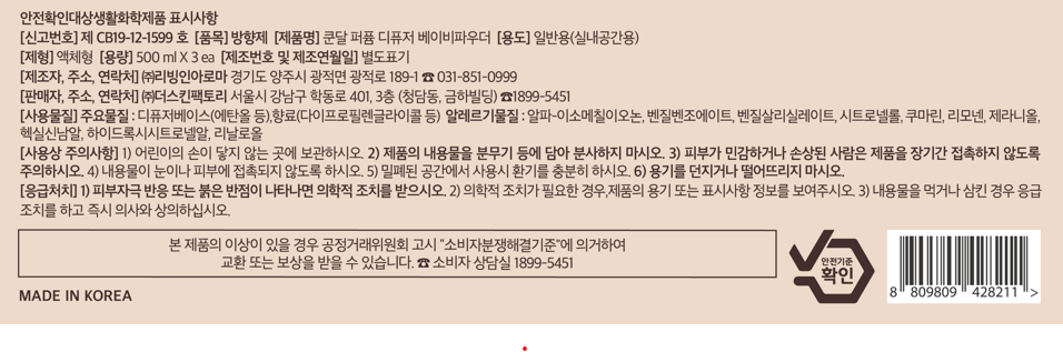 | 품목 및 제품명 | 방향제 / 쿤달 퍼퓸 디퓨저 베이비파우더 | 용도(표백제의 경우 계열을 함께표시) 및 제형 | 일반용(실내공간용) / 액체형 |