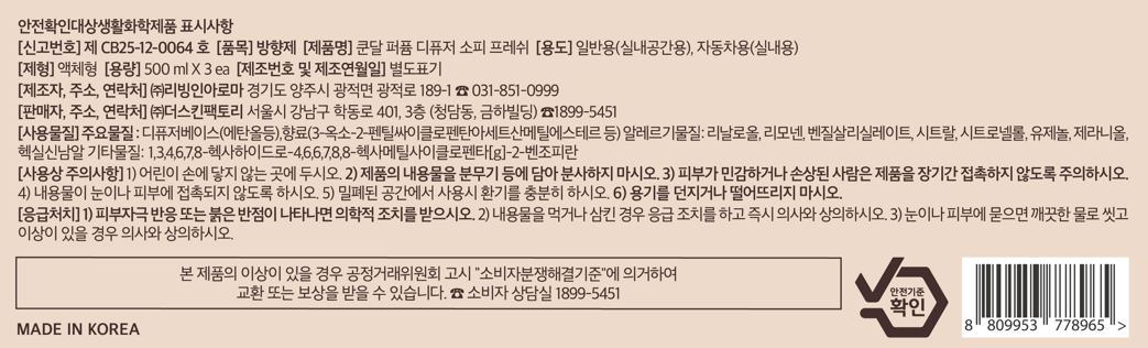 | 품목 및 제품명 | 방향제 / 쿤달 퍼퓸 디퓨저 소피 프레쉬 | 용도(표백제의 경우 계열을 함께표시) 및 제형 | 일반용(실내공간용), 자동차용(실내용) / 액체형 |