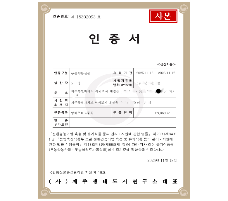 | 생산자(수입자) | 상품상세페이지 인증서 참조 | 원산지 | 제주특별자치도 |