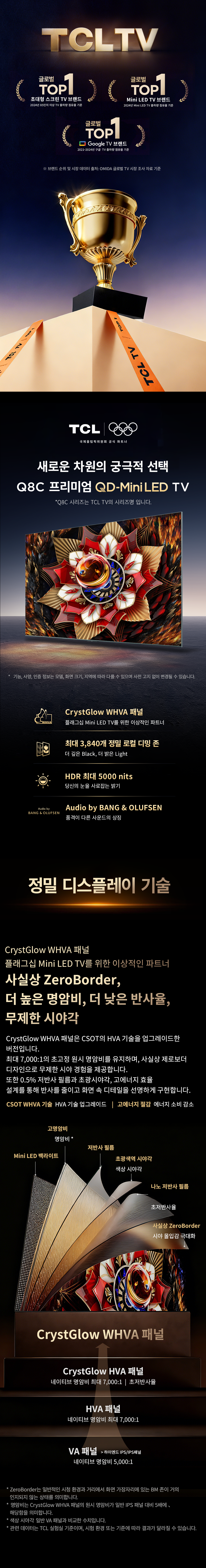| 품명 및 모델명 | TCL 4K QD Mini LED 스마트 TV, 65Q8C | KC 인증정보 | 본품 : XU090397-25131, R-R-TcL-65C8K / 무선모듈 : R-R-Gsd-WKXT0TM2501 |