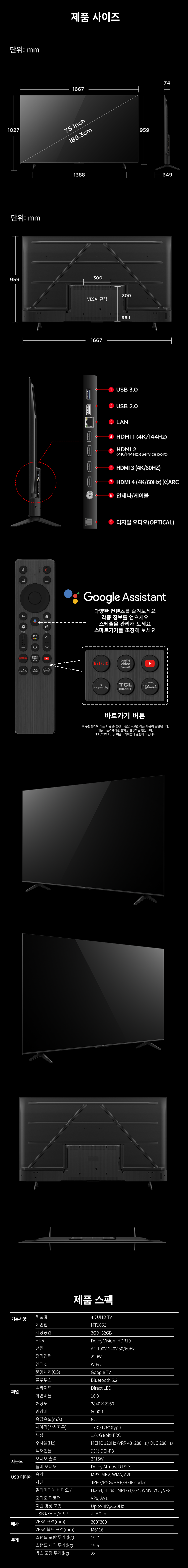 | 품명 및 모델명 | 텔레비전수상기 / 75U75 | KC 인증정보 | 본품 : XU090462-25039, R-R-Hc5-75U75 / 무선모듈 : R-C-Gsd-WKCT2HM2501 |