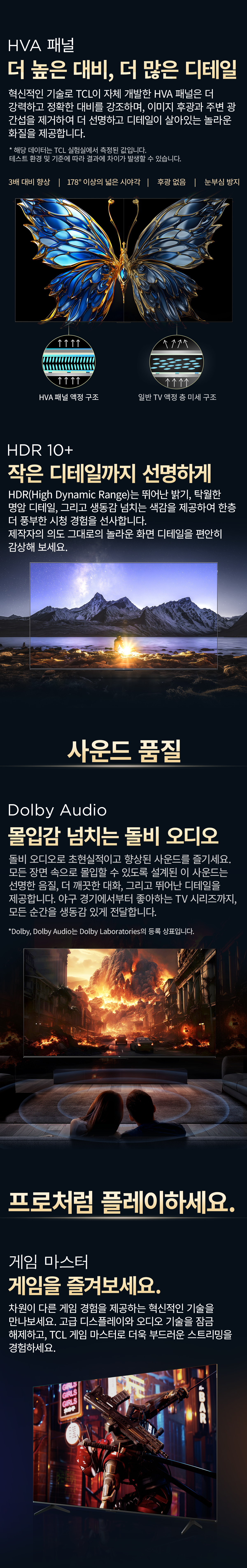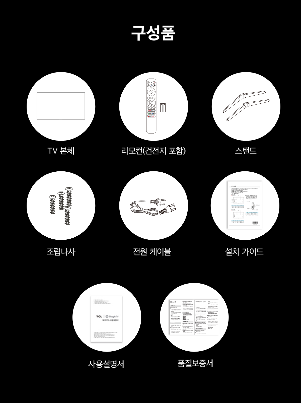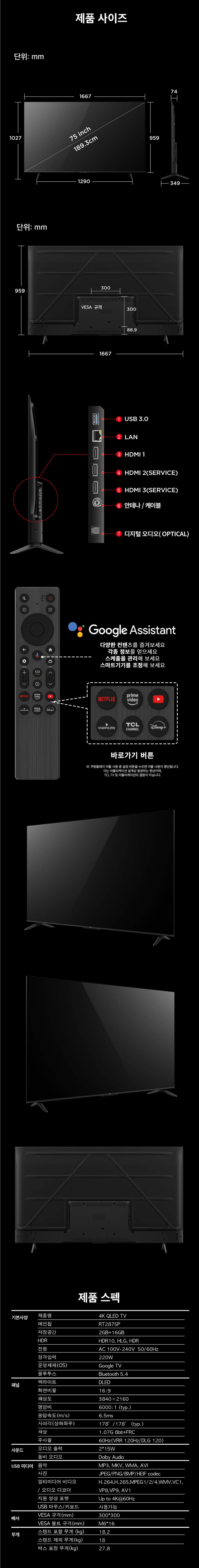 | 품명 및 모델명 | TCL 4K QLED Google TV, 75T6C, 방문설치, 스탠드형, 189cm(75인치) / 75T6C | KC 인증정보 | 본품 : XU090397-25115, R-R-TcL-75T6C / 무선모듈 : R-R-Gsd-WKCT16R2501 |