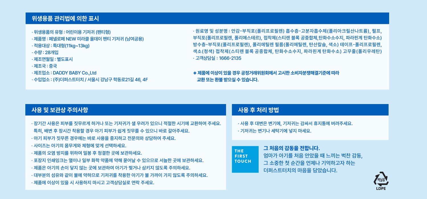 | 품명 및 모델명 | 페넬로페 NEW 미라클 올데이 밴드 기저귀 (남여공용) | 인증/허가 사항 | 위생용품 |