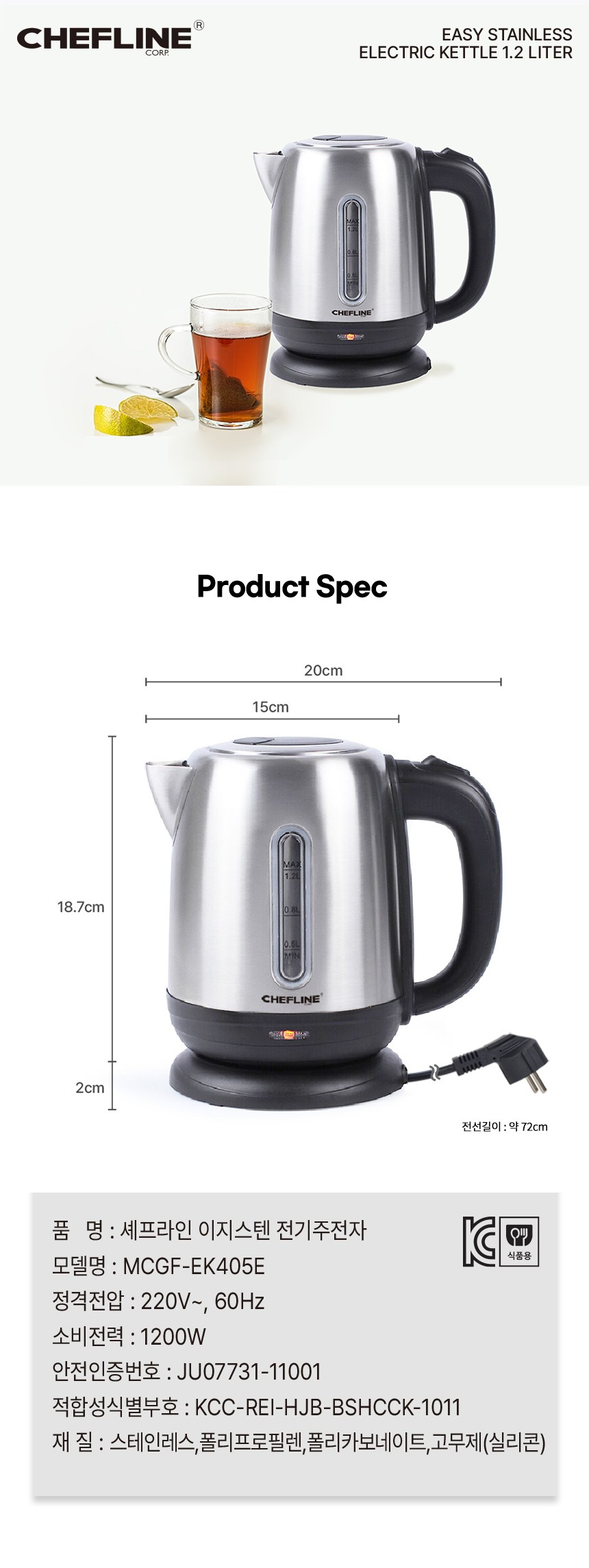 | 품명 및 모델명 | 전기주전자 / MCGF-EK405E | KC 인증정보 | JU07731-11001E, KCC-REI-HJB-BSHCCK-1011 |