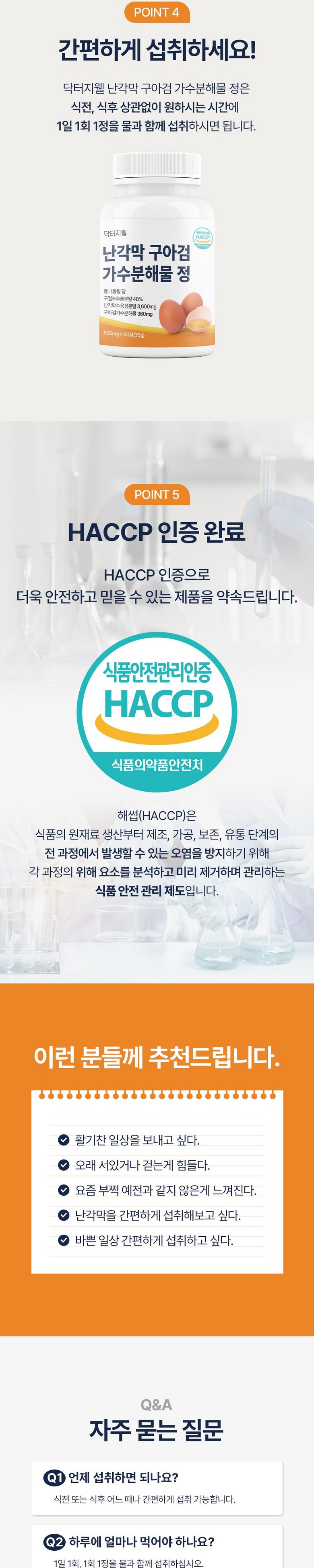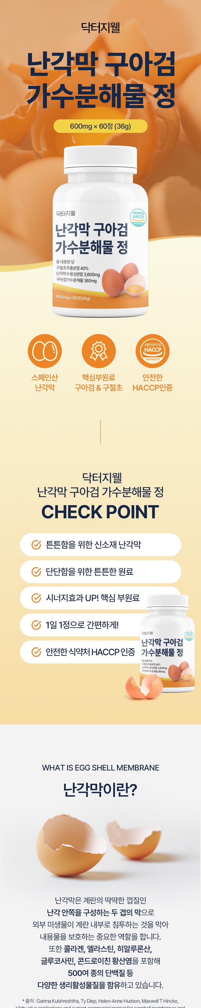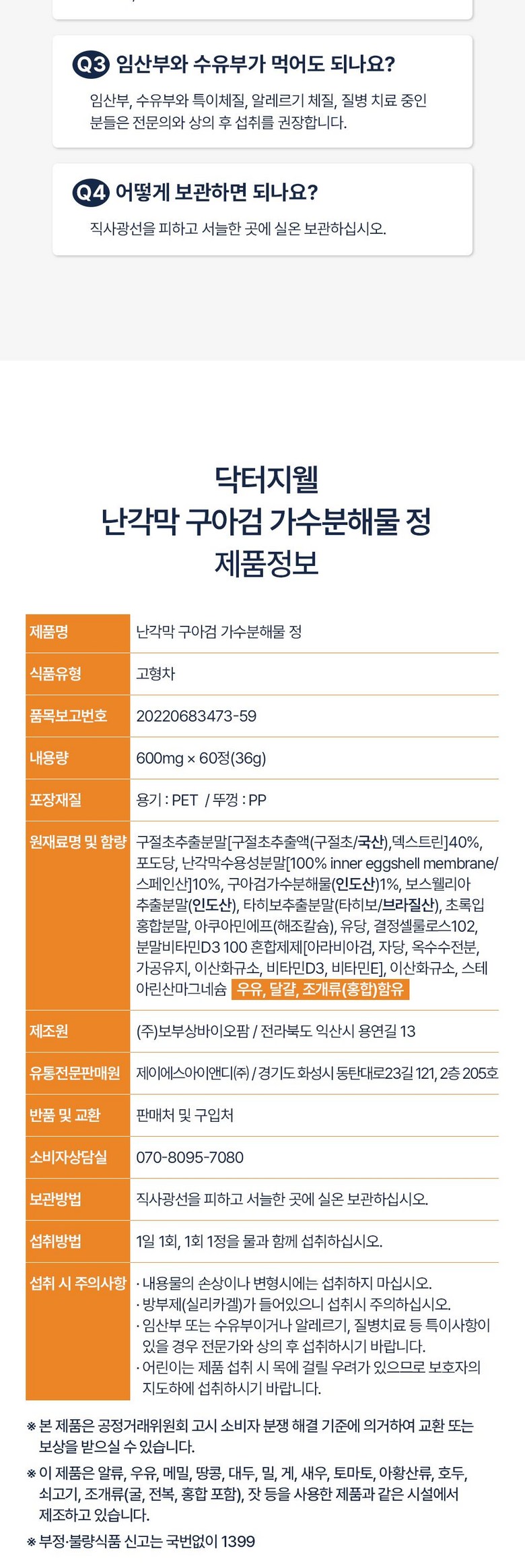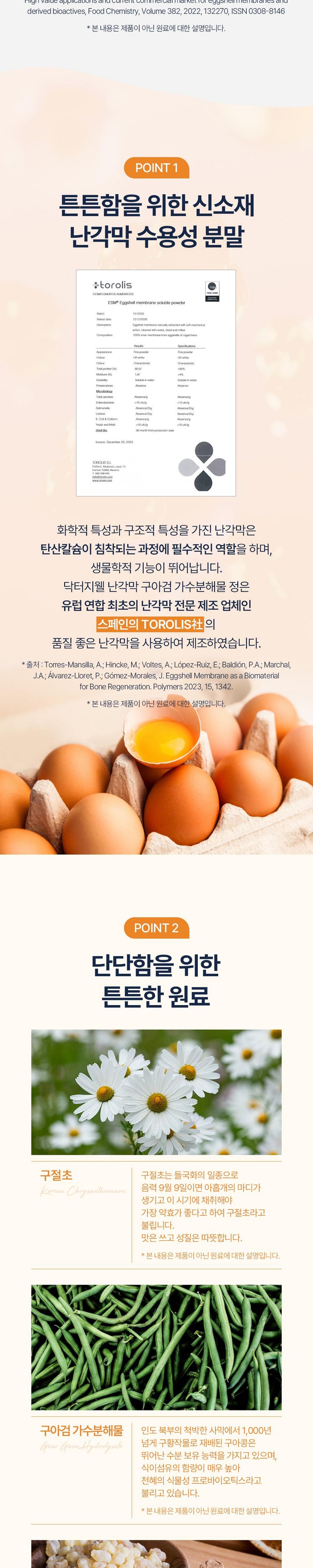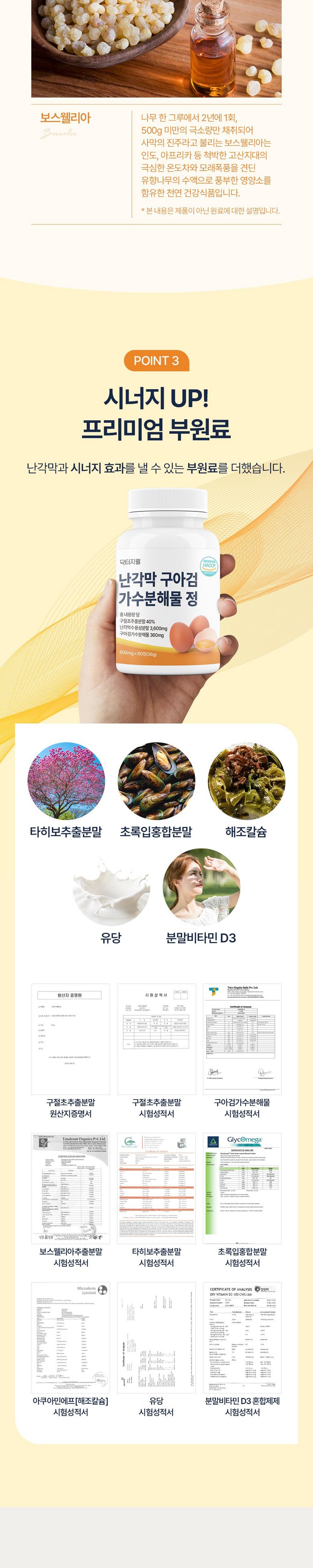 | 포장단위별 내용물의 용량(중량), 수량 | 상품 상세페이지 참조 | 원재료명 및 함량 | 구절초추출분말[구절초추출액(구절초 국산),덱스트린]40%, 포도당,난각막수용성분말[100% inner eggshell membrane/스페인산]10%,구아검가수 분해물(인도산)1%, 보스웰리아추출분말(인도산),타히 보추출물분말(타히보/브라질산), 초록입홍합분말,아쿠 아민에프(해조칼슘), 유당,결정셀룰로스102,분말비타민 D3100혼합제제[아라비아검,자당,옥수수전분,가공유지, 이산화규소,비타민D3, 비타민티,이산화규소, 스테아린 산마그네슘 [우유, 달걀, 조개류(홍합) 함유] |
