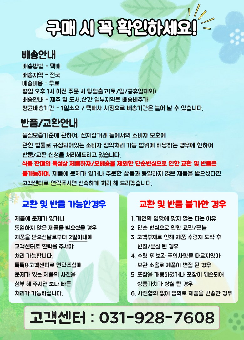- ㆍ모니터 해상도의 차이로 인해 색상이나 이미지가 실제와 달라, 고객이 단순 변심으로 교환/반품을 무료로 요청하는 경우