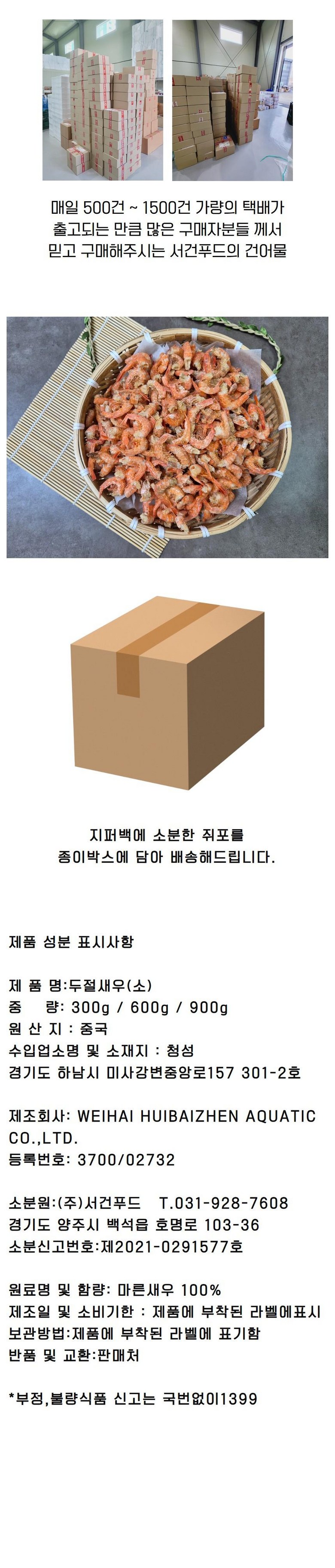 | 품목 또는 명칭 | 두절새우 | 포장단위별 내용물의 용량(중량),수량,크기 | 300g / 600g / 900g |