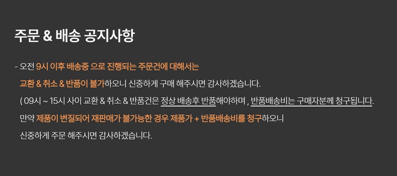 | 교환/반품 비용 (왕복비용) | 6,000원 - 단, 고객 변심의 경우에만 발생 - 도서산간 지역 배송불가 |