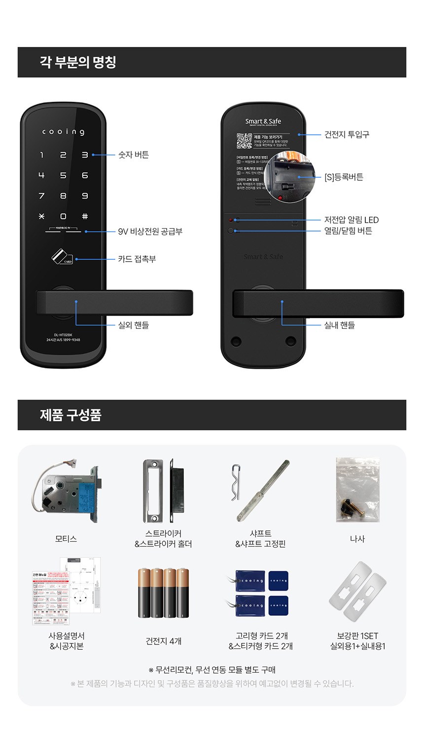 | 품명 및 모델명 | 디지털도어록 / DL-HT02BK | KC 인증정보 | 본품: KS C 9806 제10-0706호, B223H5007-17001I, R-R-IcQ-C151 / 건전지: B052R1059-19002A |