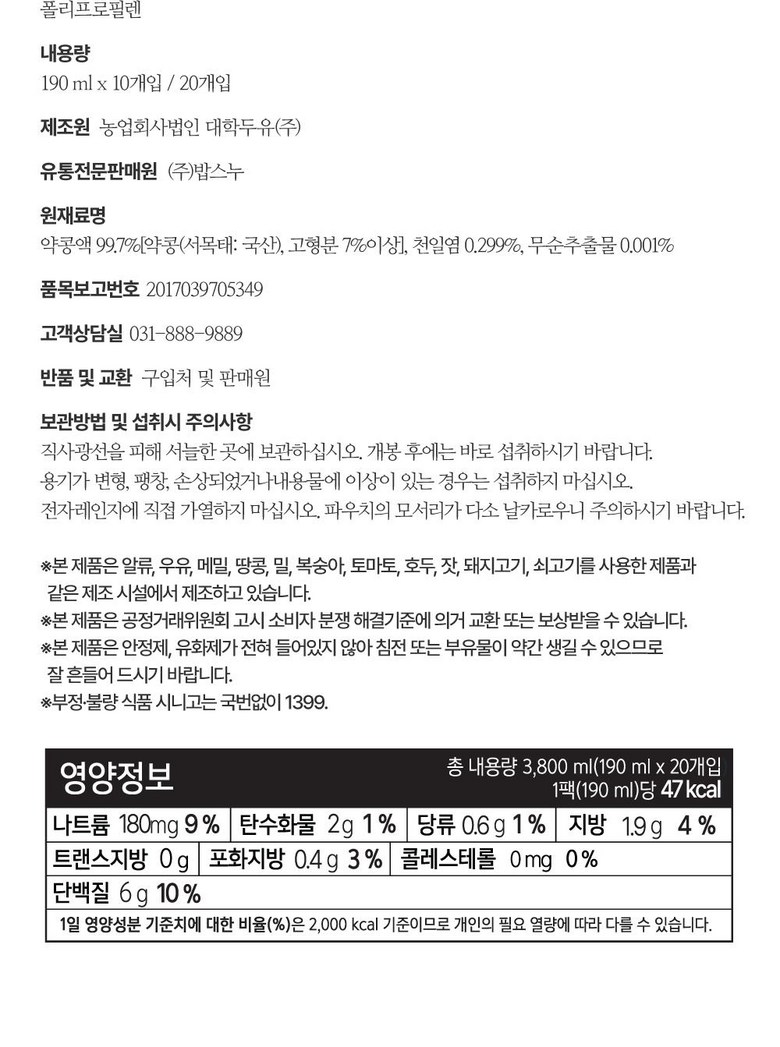 | 포장단위별 내용물의 용량(중량), 수량 | 190 ml x 10개 | 원재료명 및 함량 | 상세페이지 참조 |