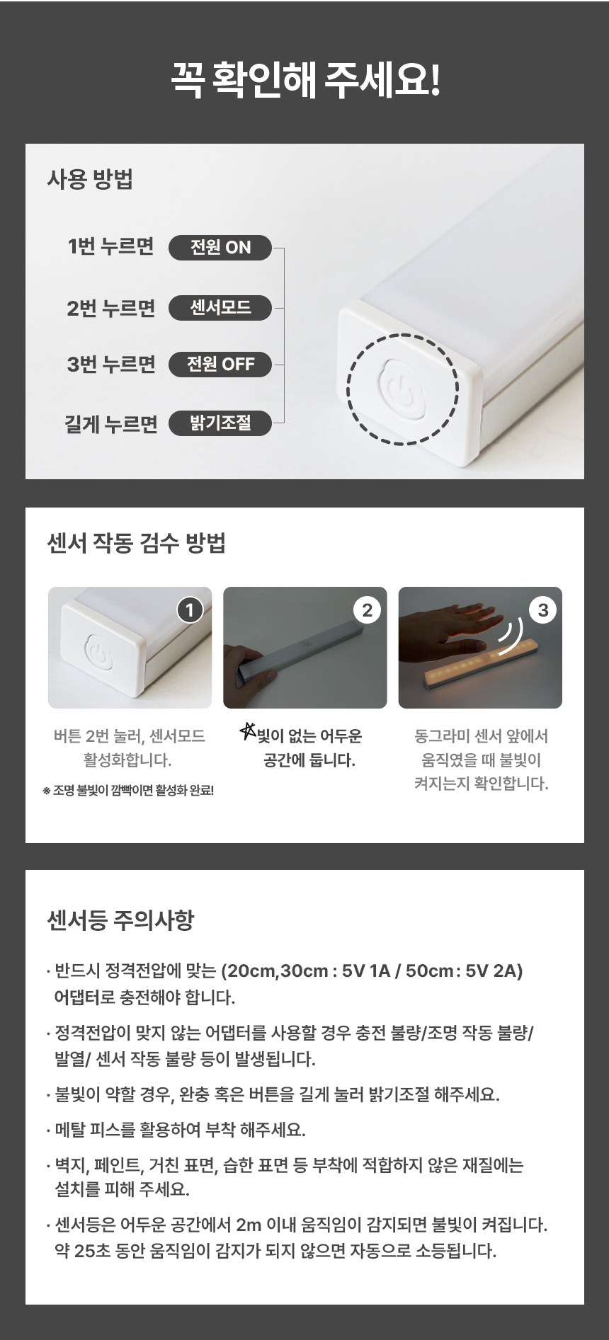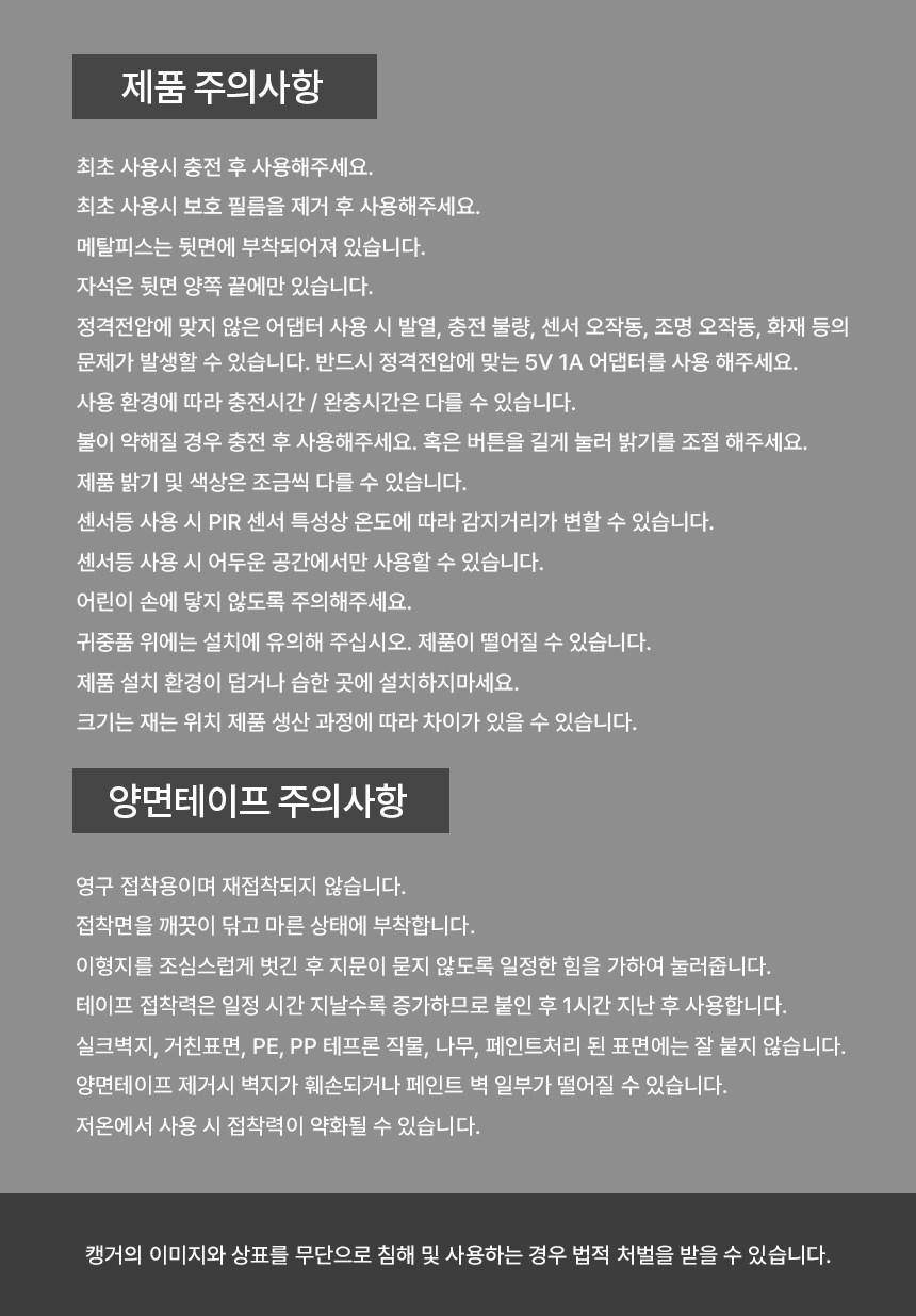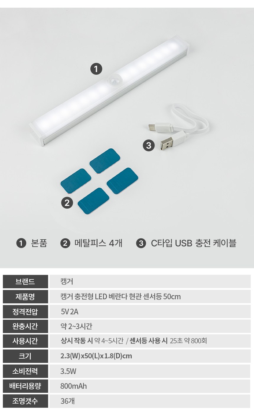 | 품명 및 모델명 | 캥거 충전형 LED 베란다 현관 센서등 50cm | KC 인증정보 | 해당없음 |