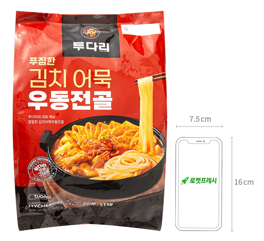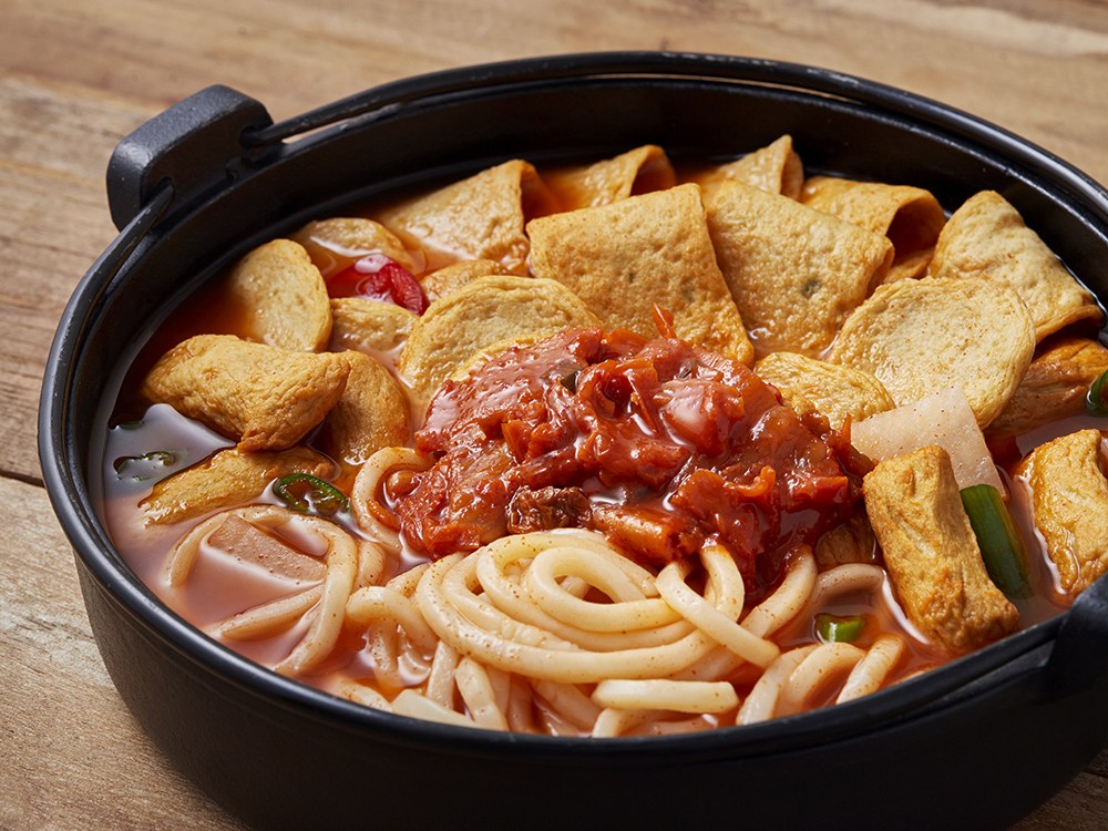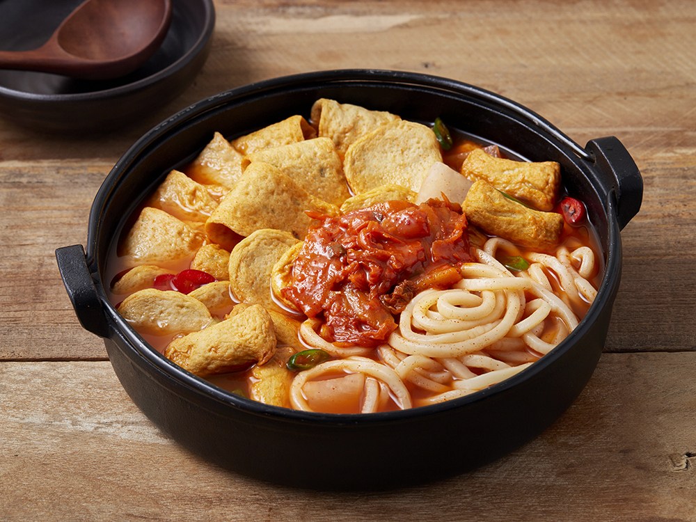 꼬치구이 전문 브랜드 투다리의 안주 메뉴, 김치 어묵 우동전골입니다. 필요한 재료가 모두 동봉되어 있어요. 시원하면서도 칼칼한 국물 맛이 일품이죠. 여기에 새콤한 김치가 아삭아삭 씹히며 입맛을 돋워준답니다. 전문점 못지 않게 맛있는 안주를 직접 조리해보세요.