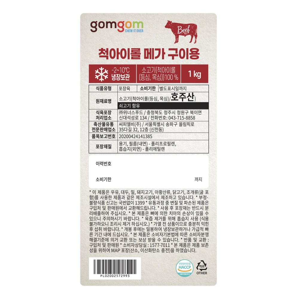 | 품목 또는 명칭 | 척아이롤 메가 구이용 | 포장단위별 내용물의 용량(중량),수량,크기 | 1kg x 3개 |