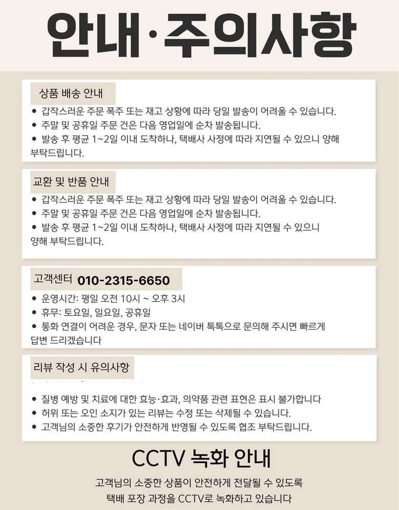 - 상품문의 및 후기게시판을 통해 취소나 환불, 반품 등은 처리되지 않습니다.