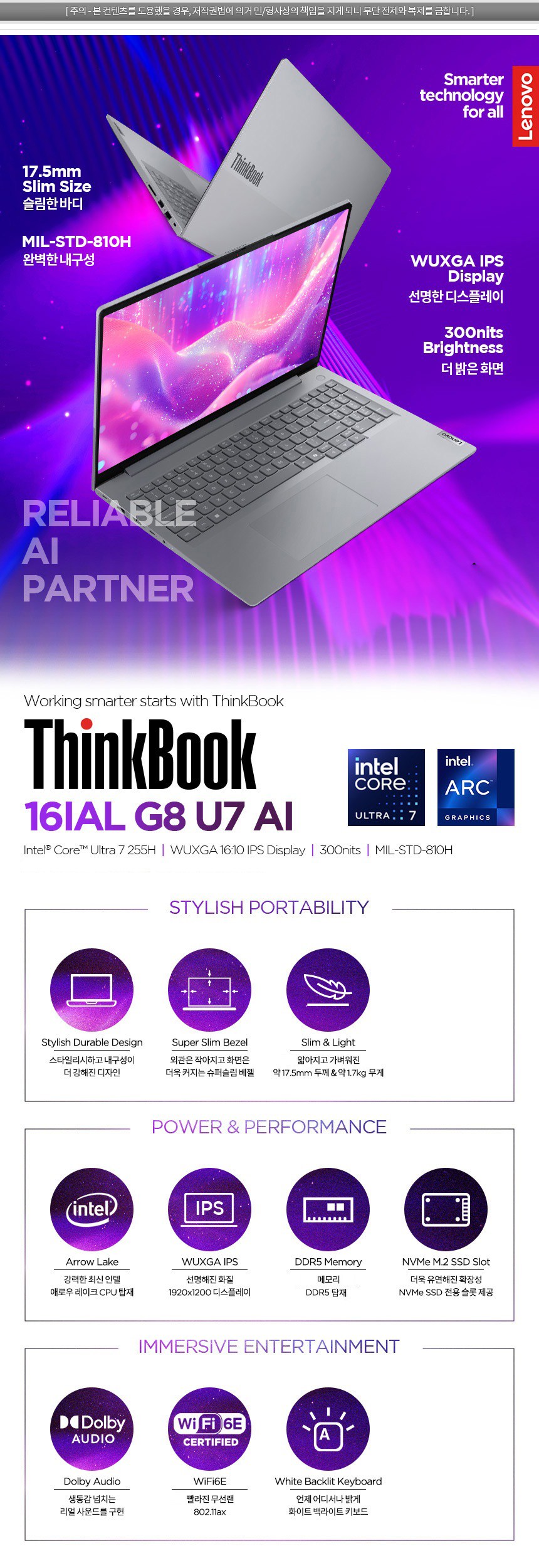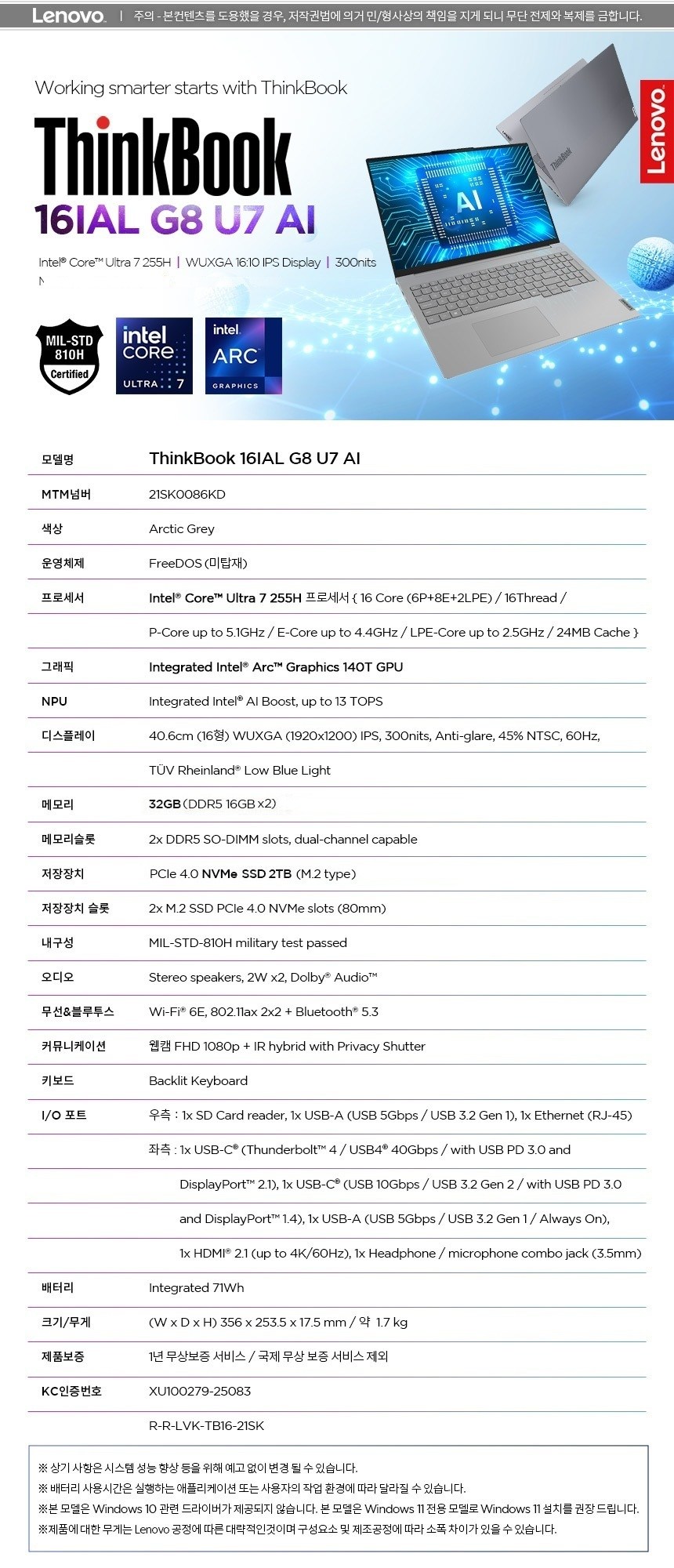 | 품명 및 모델명 | 노트북 / Thinkbook 16IAL G8 U7 AI | KC 인증정보 | 본품: XU100279-25083, R-R-LVK-TB16-21SKㅣ특정소출력무선기기: R-C-RTK-RTL8852CE |