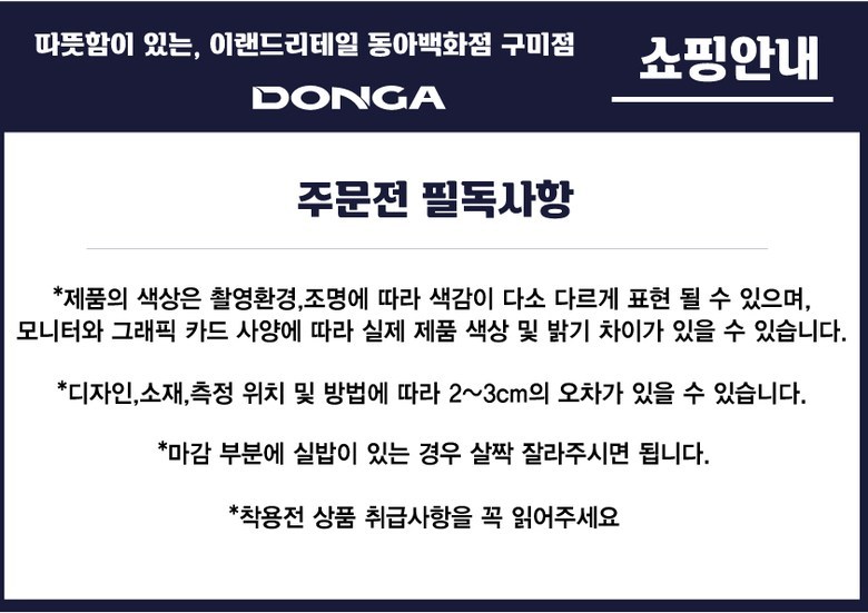 - ㆍ모니터 해상도의 차이로 인해 색상이나 이미지가 실제와 달라, 고객이 단순 변심으로 교환/반품을 무료로 요청하는 경우