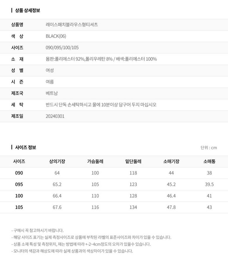 - 상의 사이즈: 여성 95