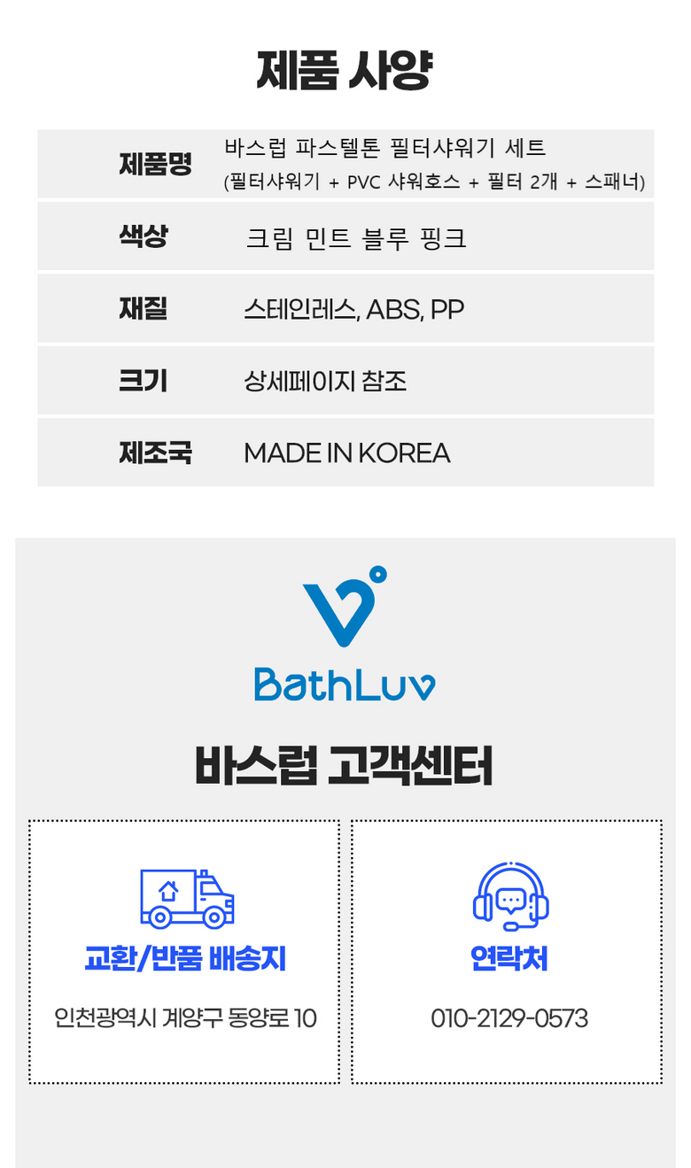 | 품명 및 모델명 | 바스럽 파스텔톤 필터 샤워기 세트 [샤워헤드 + PVC호스 1.5M + 필터 2개+스패너] | 인증/허가 사항 | 세트 한국 KCL 시험성적서 보유 및 필터 KC 인증 완료 제품 |