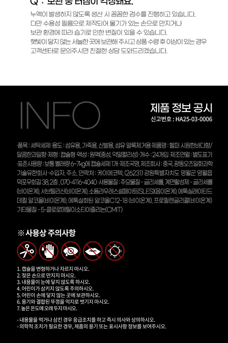 | 품목 및 제품명 | 상품 상세페이지 참조 | 용도(표백제의 경우 계열을 함께표시) 및 제형 | 상품 상세페이지 참조 |