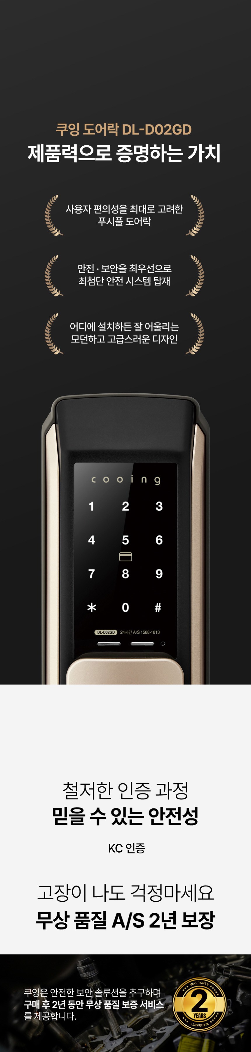 | 품명 및 모델명 | 도어록/DL-D02GD | KC 인증정보 | 본품 : B223D5005-21004D,R-R-EVF-AK-S101P-FS , 건전지 : B052R1138-20002B |
