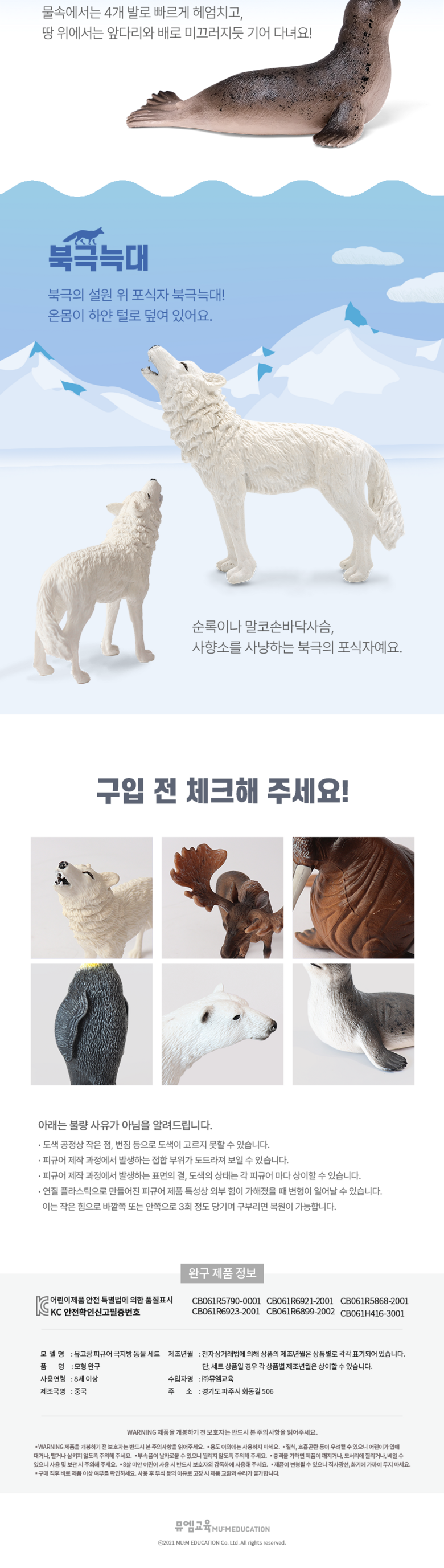 | 품명 및 모델명 | 뮤고랑 극지방 동물 피규 | KC 인증정보 | KCL / CB061R5790-0001 |