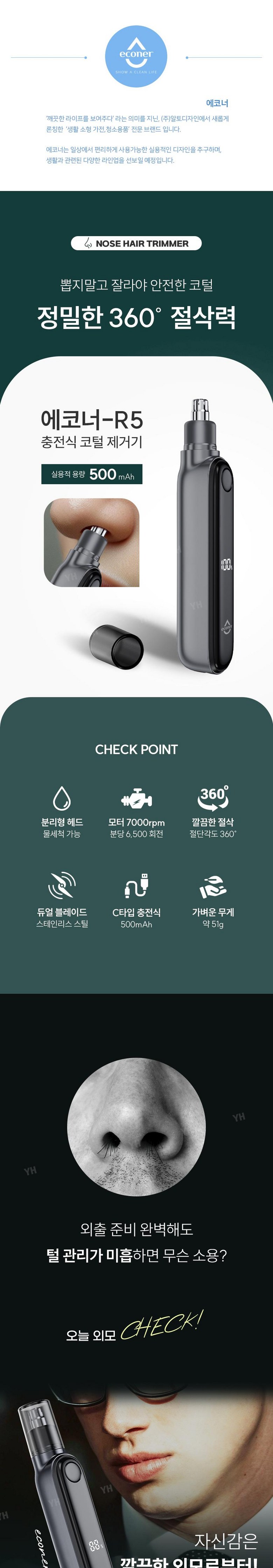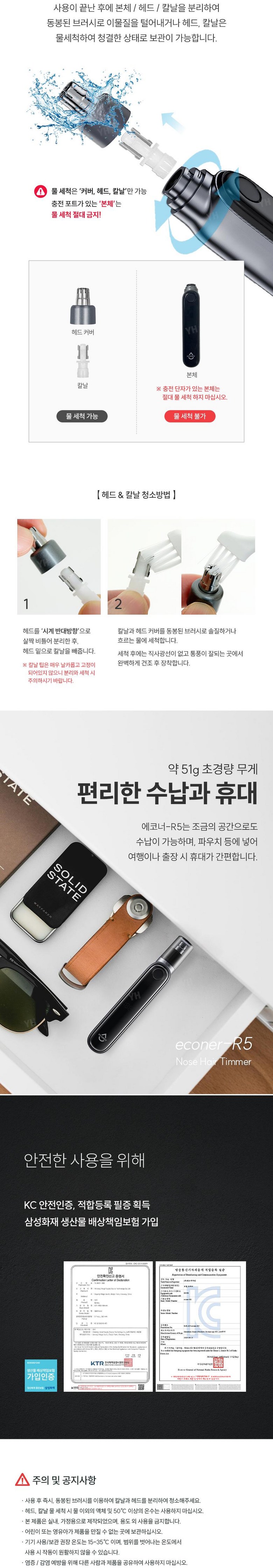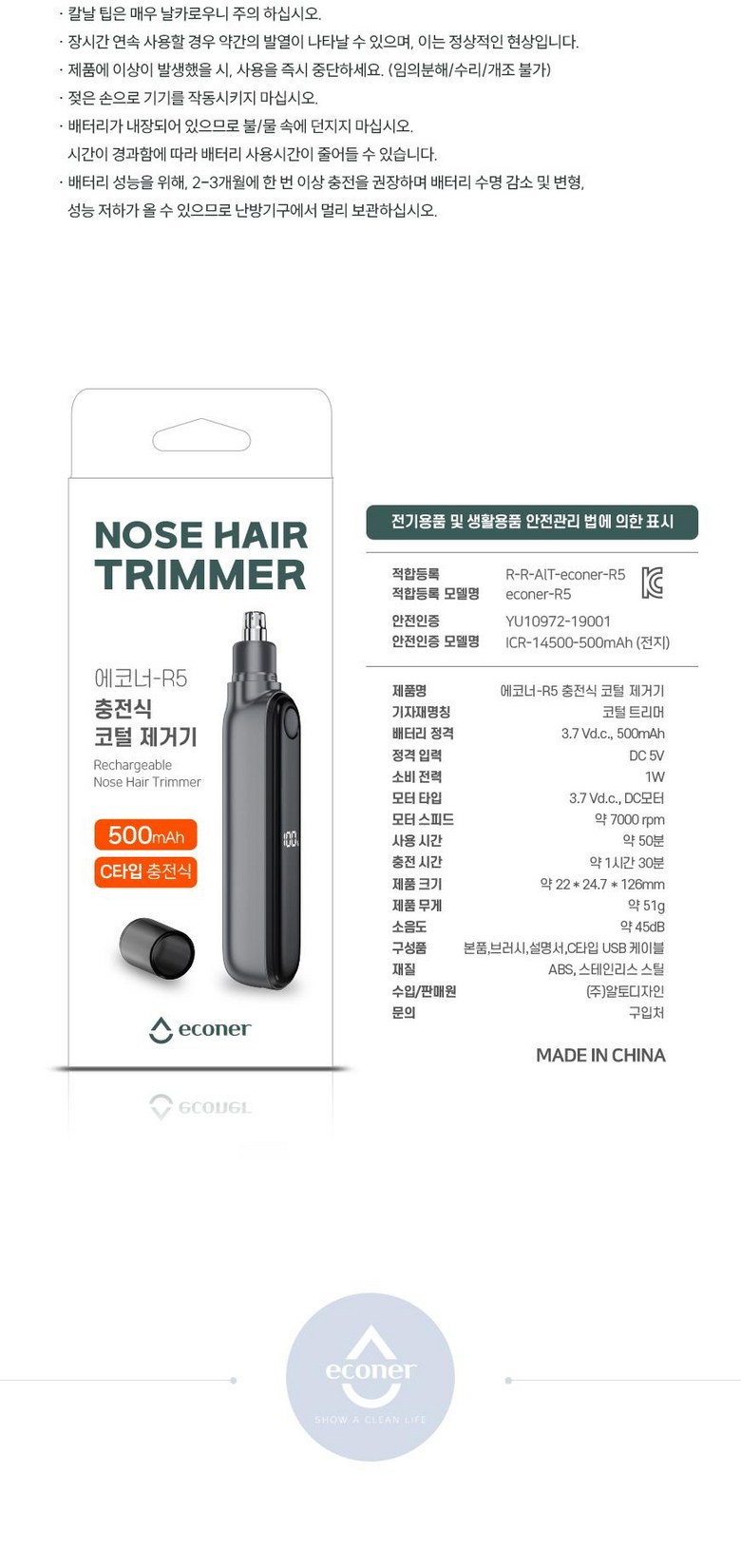 | 품명 및 모델명 | 에코너 R5 충전식 코털 제거기 | KC 인증정보 | [적합등록번호] : R-R-AJT-econer-R5 (모델명:econer-R5 | [안전인증번호]: YU10972-19001 |