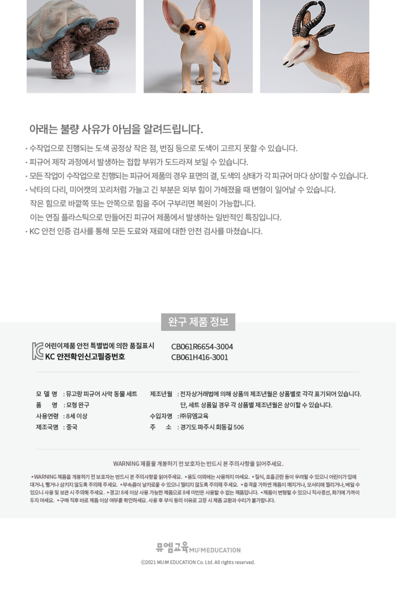 | 품명 및 모델명 | 뮤고랑 사막동물 피규어 세트 | KC 인증정보 | KCL / CB061R6654-3004 |