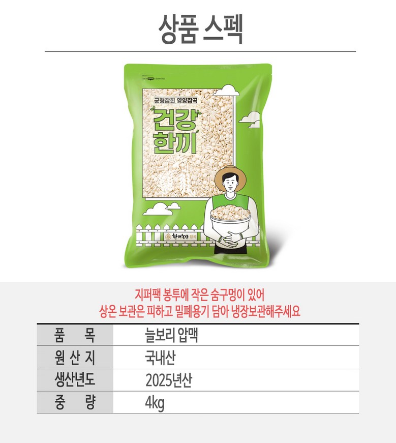 | 품목 또는 명칭 | 늘보리 압맥 | 포장단위별 내용물의 용량(중량),수량,크기 | 용량(중량):상품상세참조 / 크기:상품상세참조 / 수량:상품상세참조 |