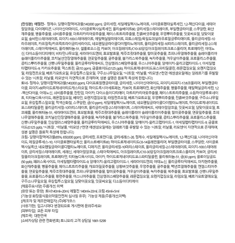 | 화장품제조업자, 화장품책임판매업자 및 맞춤형화장품판매업자 | 상품 상세페이지 참조 | 제조국 | 상품 상세페이지 참조 |
