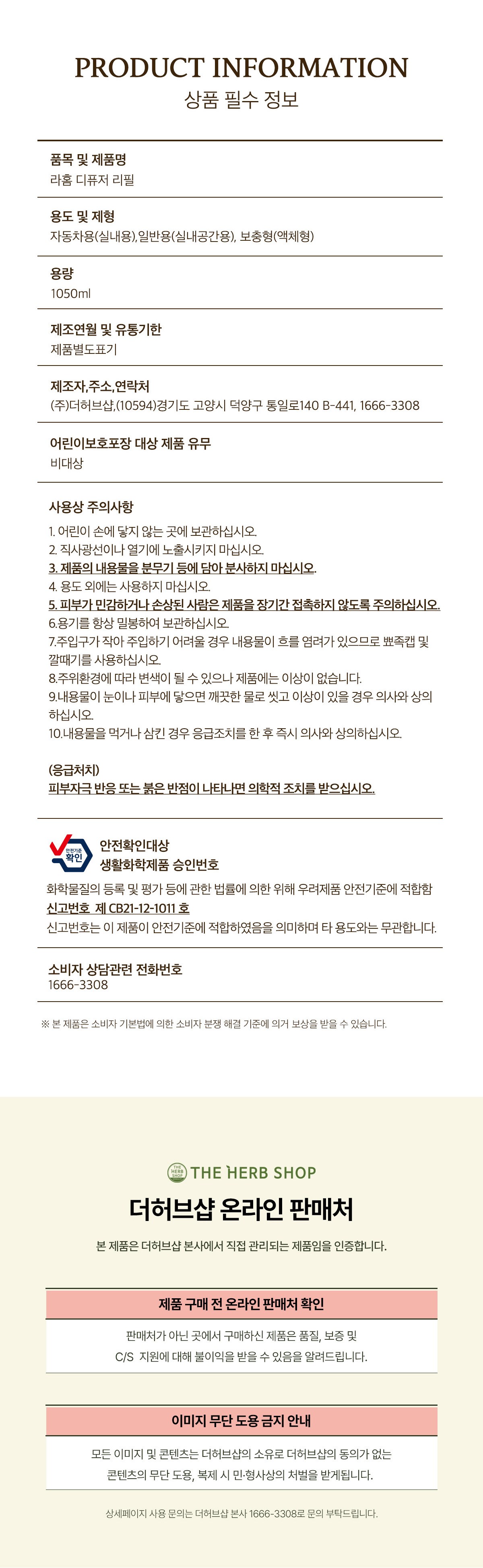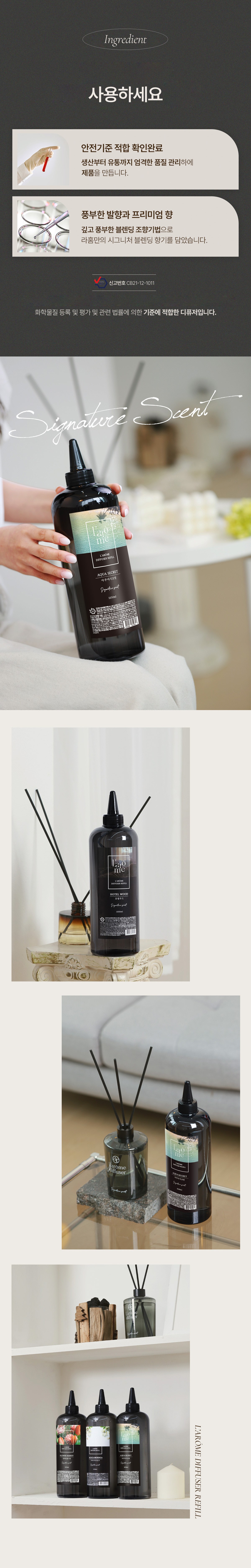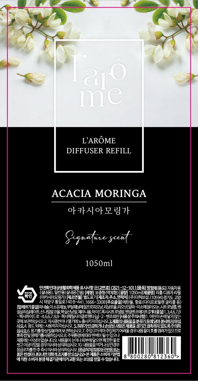 | 품목 및 제품명 | 방향제 / 라홈 디퓨저 리필(아카시아모링가) | 용도(표백제의 경우 계열을 함께표시) 및 제형 | 일반용(실내공간용),자동차용(실내용) / 보충형(액체형) |