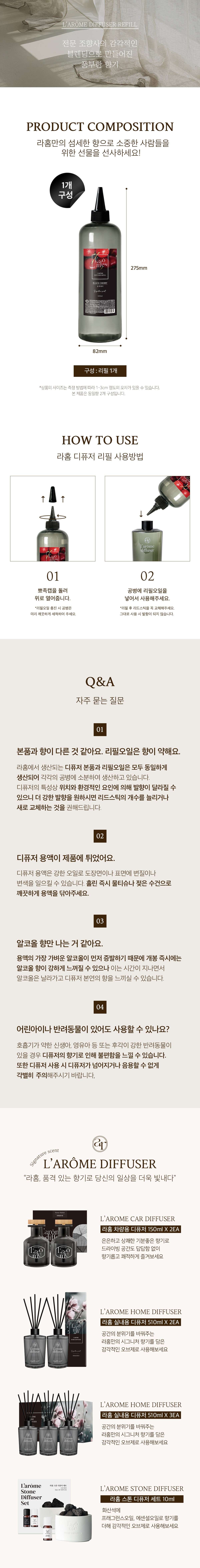 | 품목 및 제품명 | 방향제 / 라홈 디퓨저 리필(양재동꽃시장) | 용도(표백제의 경우 계열을 함께표시) 및 제형 | 일반용(실내공간용),자동차용(실내용) / 보충형(액체형) |