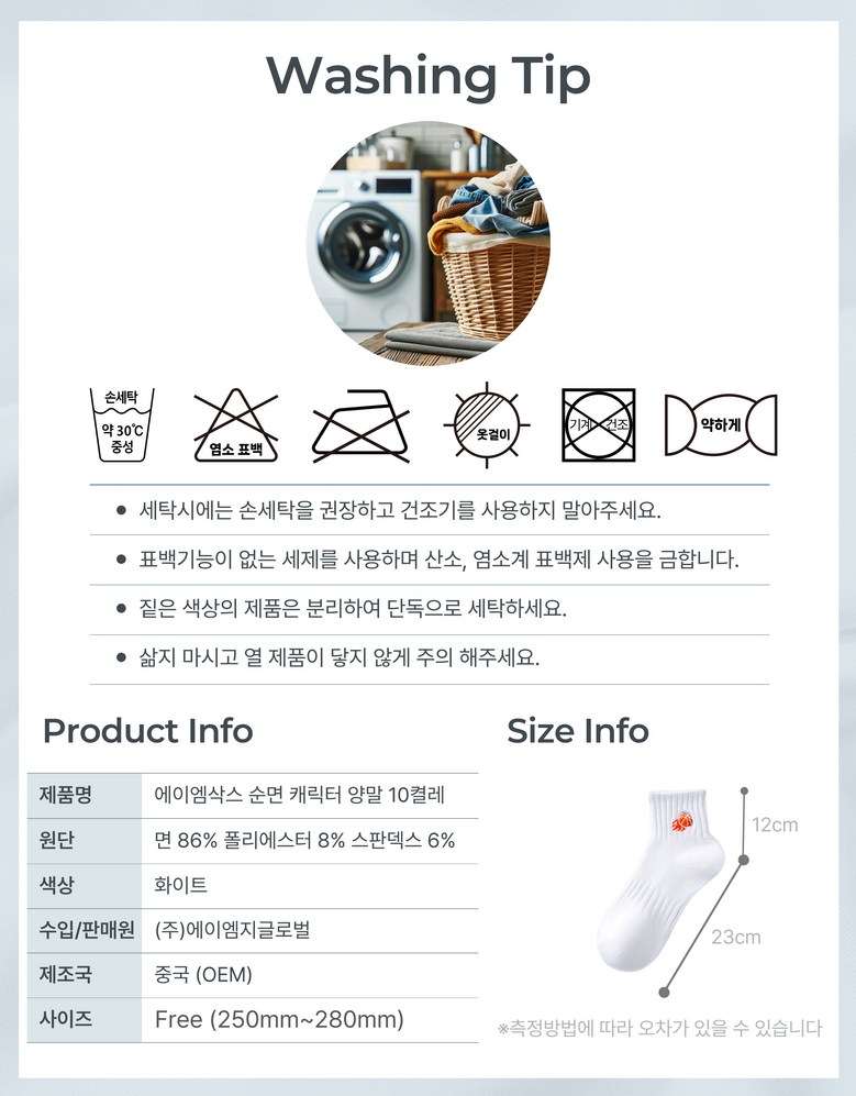 | 제조국 | 중국 (OEM) | 취급시 주의사항 | 손세탁 권장, 건조기 사용 금지, 염소계 표백제 사용 금지 |