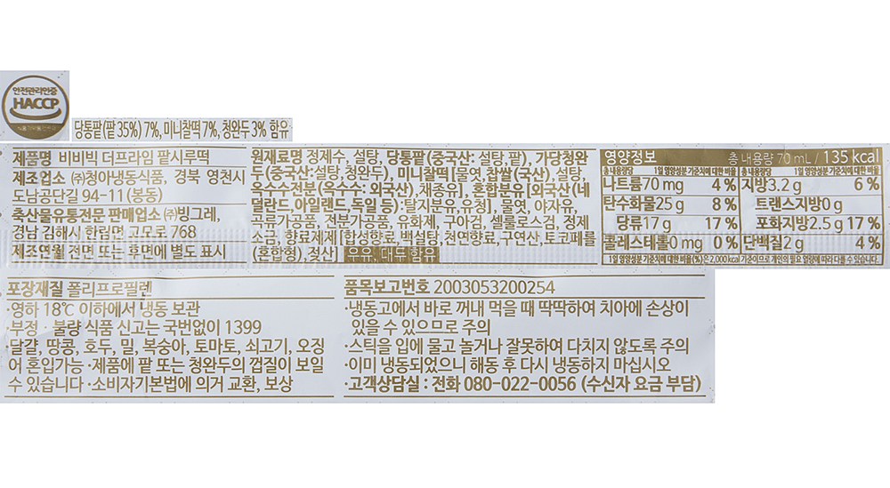 쫀득하면서도 사각사각한 식감이 매력적인 비비빅이에요. 가당청완두와 미니찰떡을 넣어 색다른 맛을 선사해요. 고소한 맛과 달콤한 맛이 씹을수록 조화롭게 어우러지죠. 시원한 간식이 생각날 때, 냉동실에서 꺼내 한 손에 들고 손쉽게 즐겨보세요.