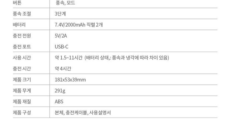 - 전원공급방식: USB 충전식