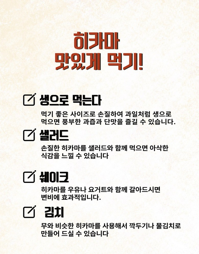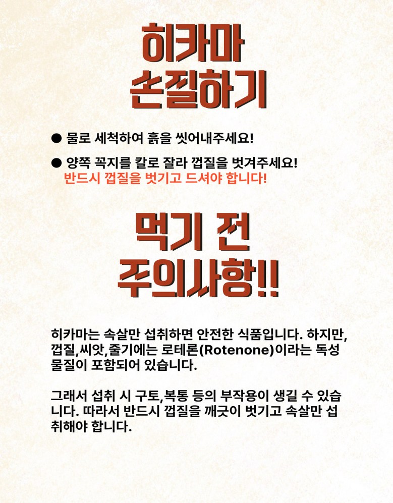 | 품목 또는 명칭 | 히카마(얌빈) | 포장단위별 내용물의 용량(중량),수량,크기 | 상품 상세페이지 참조 |