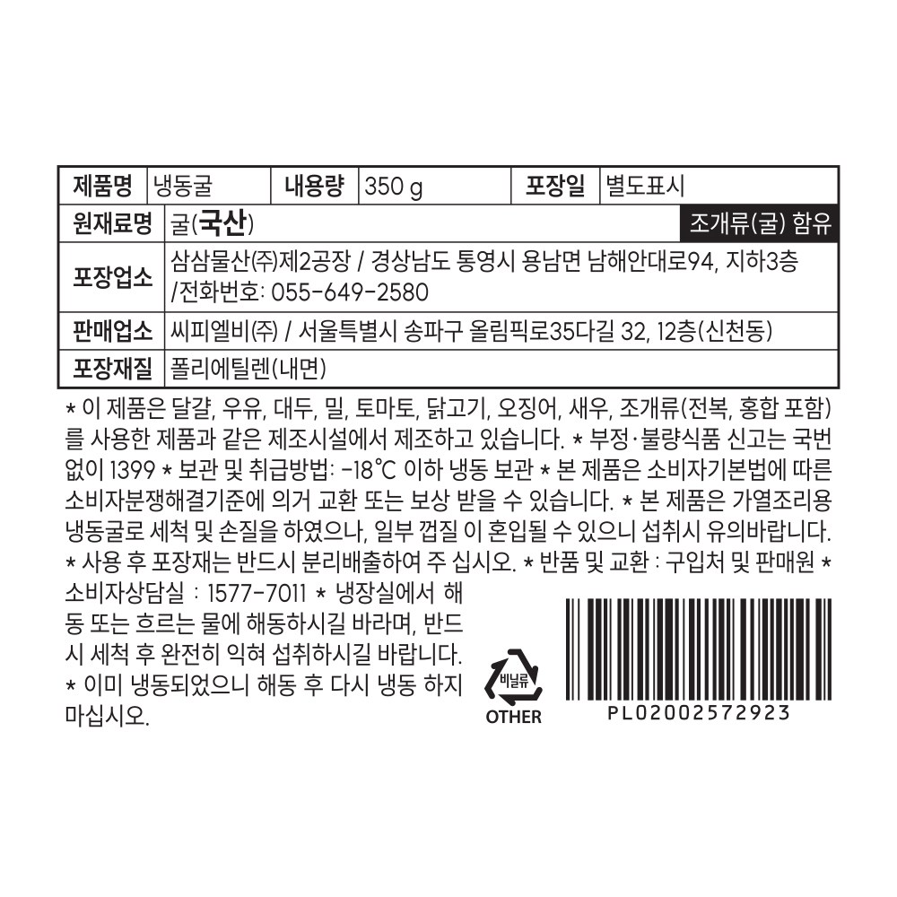 | 품목 또는 명칭 | 냉동굴 | 포장단위별 내용물의 용량(중량),수량,크기 | 350g x 2개 |