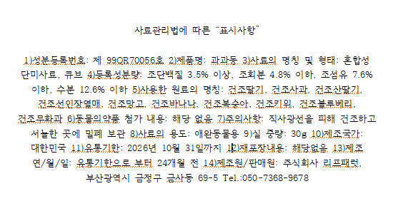 | 품명 및 모델명 | 앵큐브 과과동 | 인증/허가 사항 | 사료관리법에 따른 성분등록번호 : 컨텐츠 참조 |