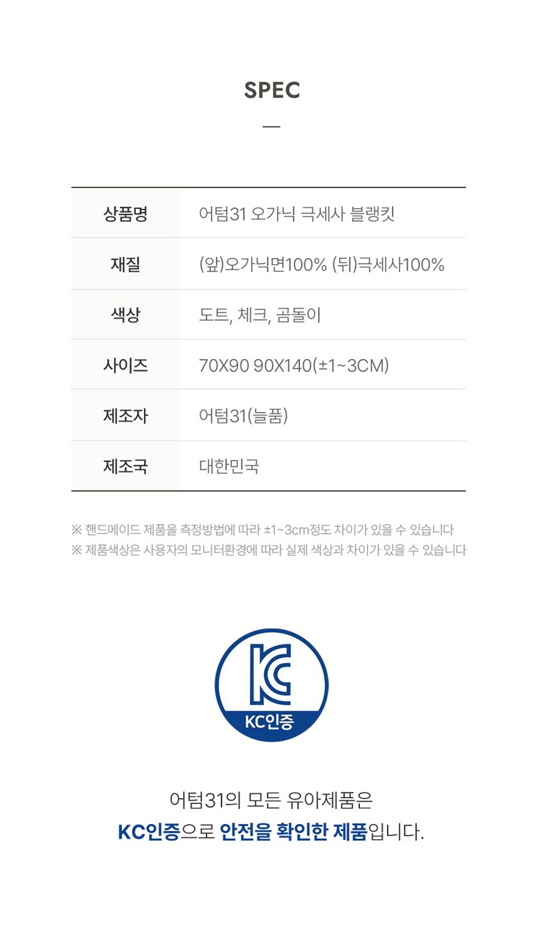 | 품명 및 모델명 | 어텀31 아기 극세사 블랭킷 | KC 인증정보 | CB015D0027-2007 |