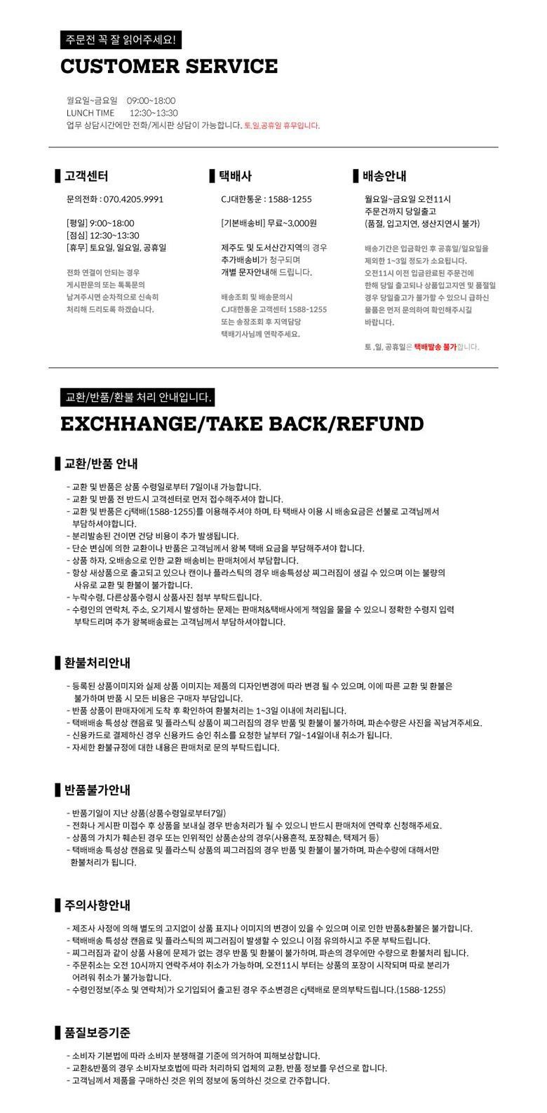 - ㆍ교환/반품에 관한 일반적인 사항은 판매자가 제시사항보다 관계법령이 우선합니다.