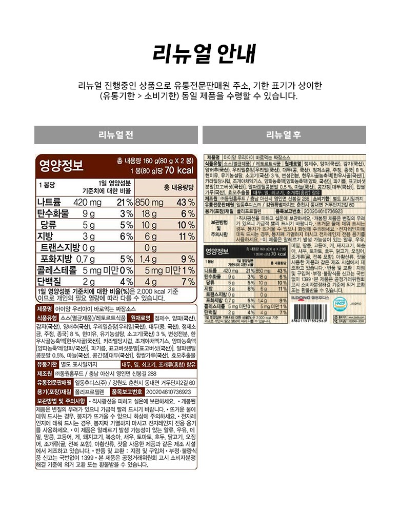 | 포장단위별 내용물의 용량(중량), 수량 | 160g*8개 | 원재료명 및 함량 | 컨텐츠참조 |