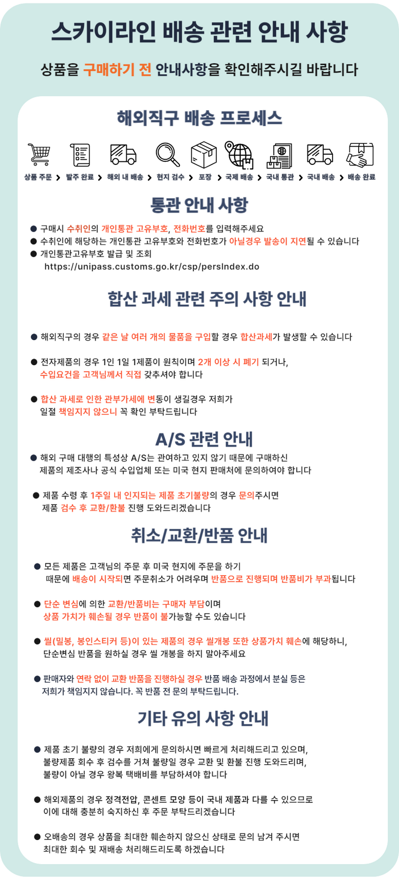 - 주문일 기준 동일 판매자 총 구매 금액이 면세 한도 초과 시 관부가세가 부과될 수 있습니다.