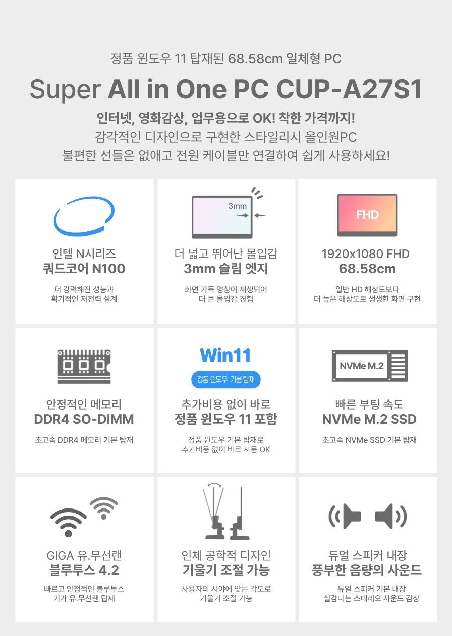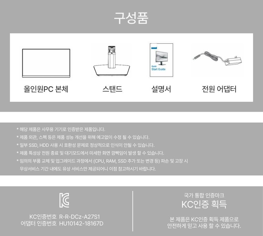 | 품명 및 모델명 | 디클 2025 68.58cm N100 올인원 일체형PC / CUP-A27S1 | KC 인증정보 | 본품 : R-R-DCz-A27S1 / 어댑터 : HU10142-18167D, R-REM-FSZ-FSP060-DHAN3 / 마우스 : R-R-DCz-DWM03 , 건전지 : B053R5048-24002 / 키보드 : R-R-DCz-DWK03, 건전지 : B053R5048-24003 / 리시버 : R-R-DCz-DWR03 |