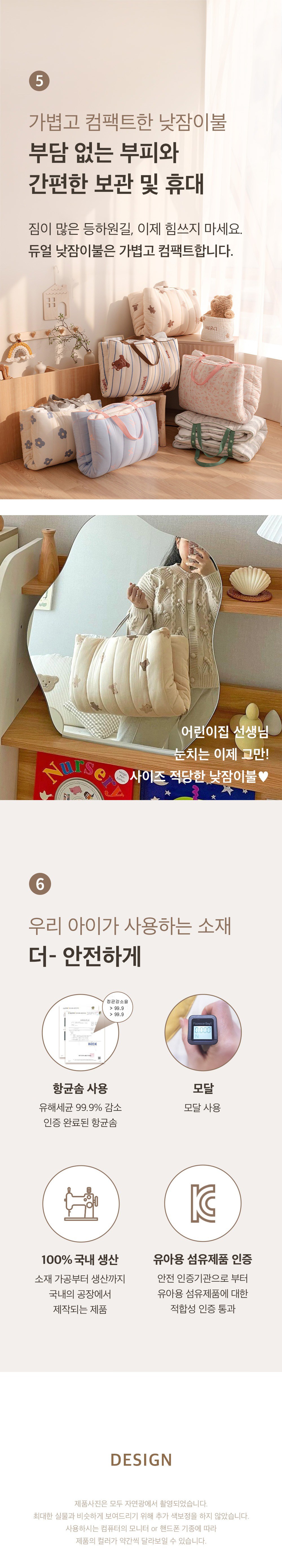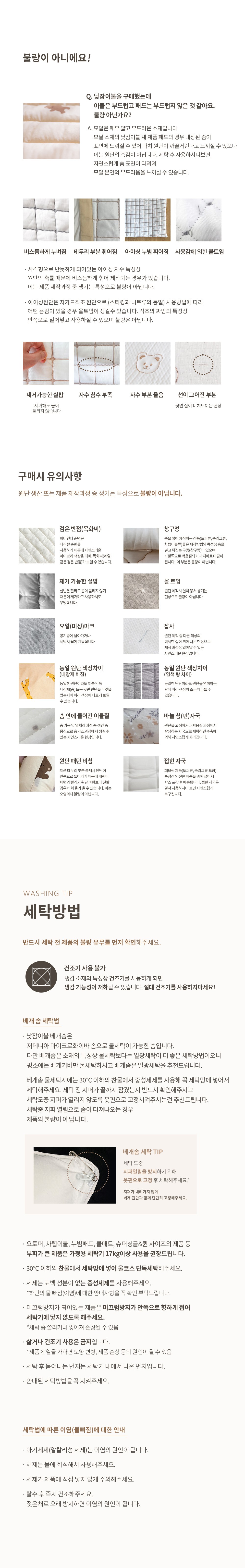 | 색상 | 혼합색상 | 재질 | 패드 앞면: 모달70%+면30%, 뒷면: 폴리에틸렌100%, 충전재: 폴리에스터100% / 이불 겉면: 모달70%+면30%, 충전재: 폴리에스터100% |
