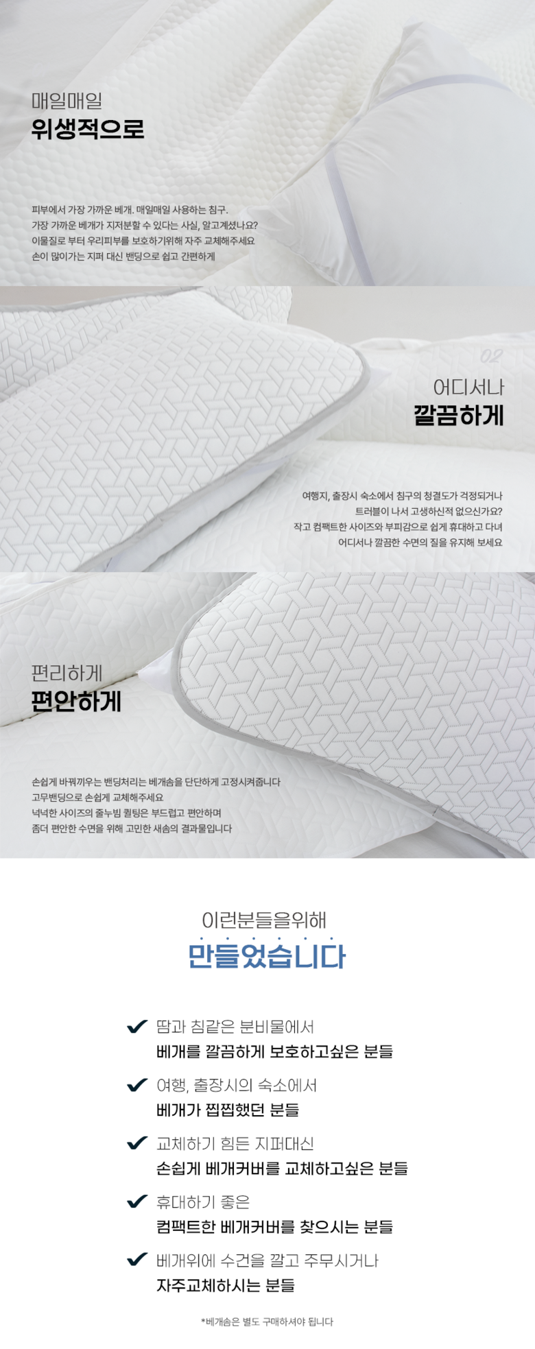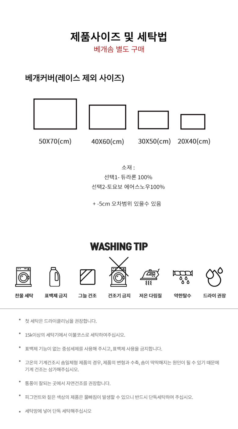 | 치수 | 50x70, 40x60, 30x50, 20x40(+-5cm 차이 날 수 있습니다) | 제품구성 | 베개커버 2장 세트구성 |