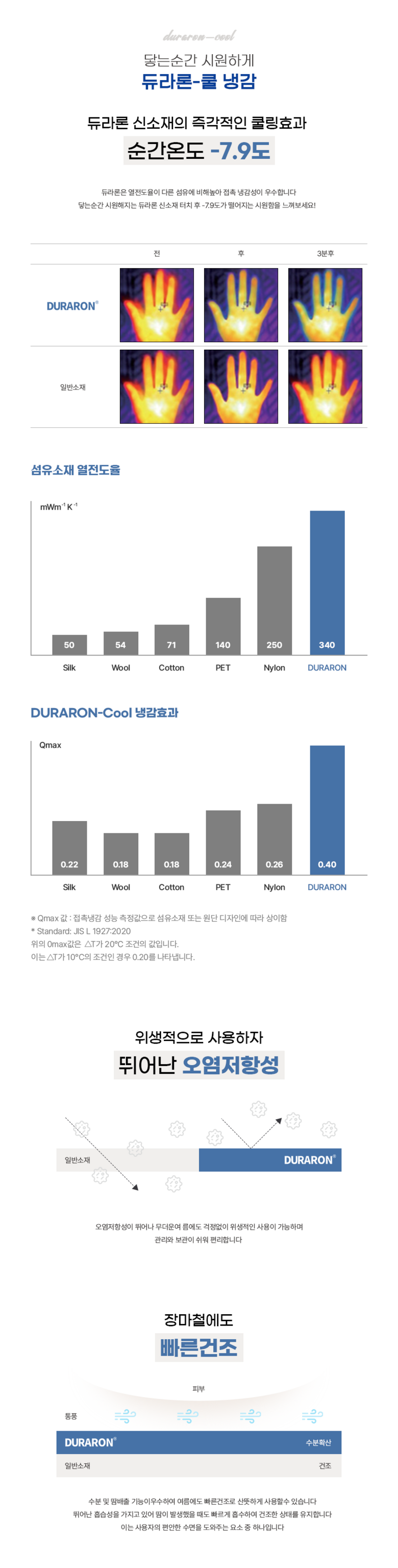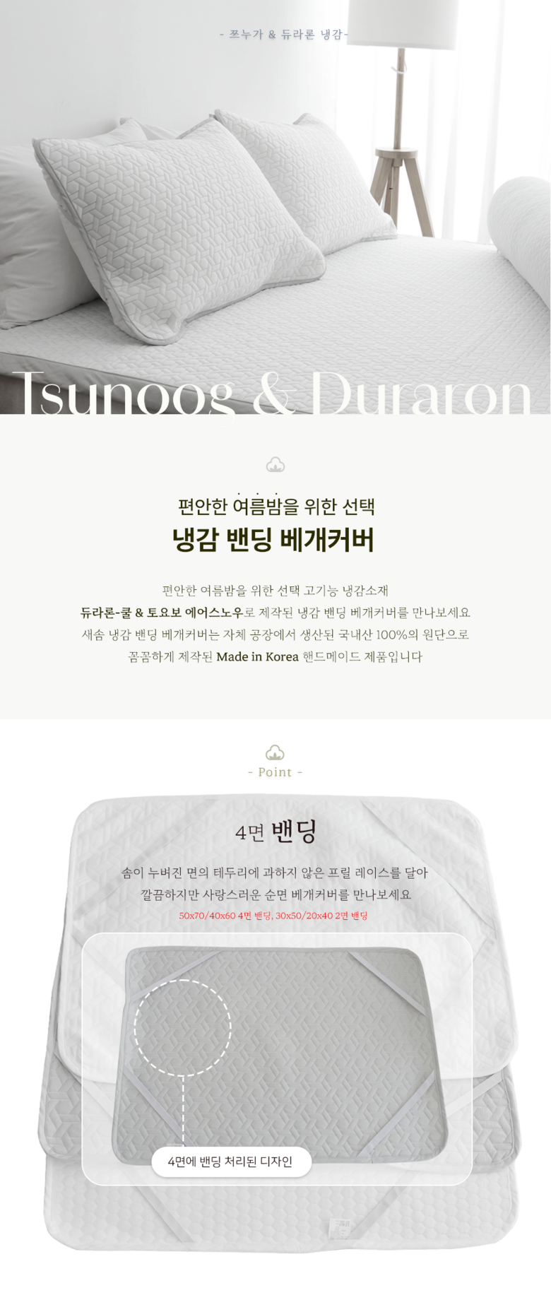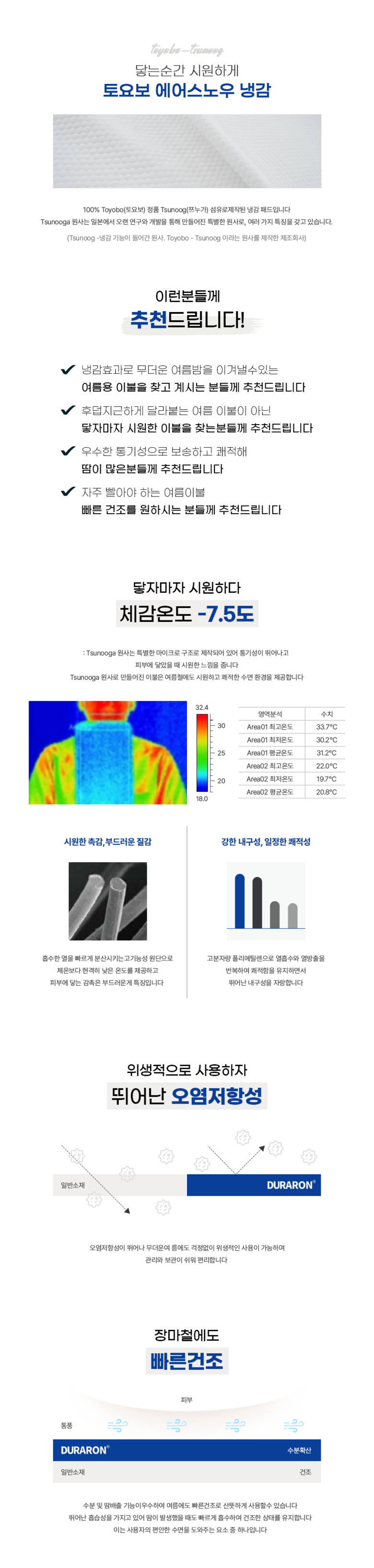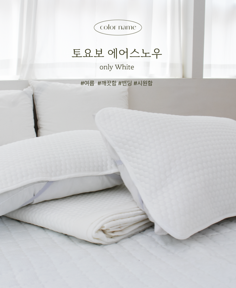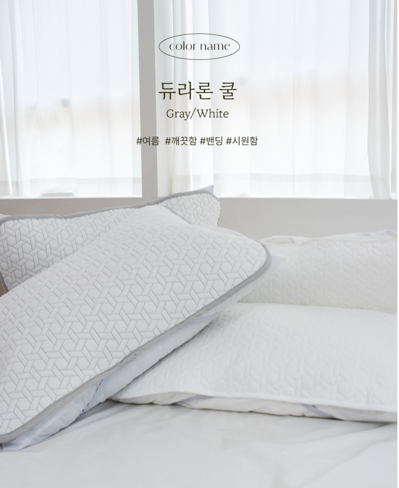| 제품 소재 | 선택1: 듀라론 쿨 냉감100%선택2: 토요보 에어스노우 냉감100% | 색상 | 선택1: 듀라론 쿨 냉감100%(화이트, 그레이)선택2: 토요보 에어스노우 냉감100%(화이트) |
