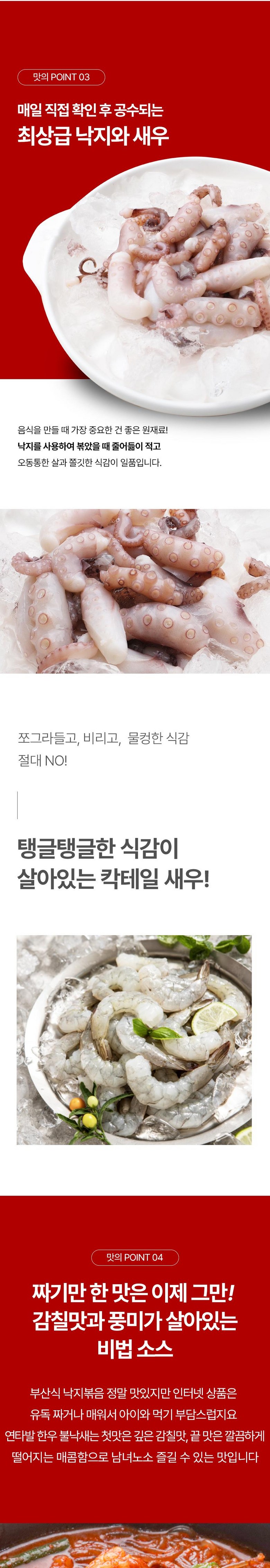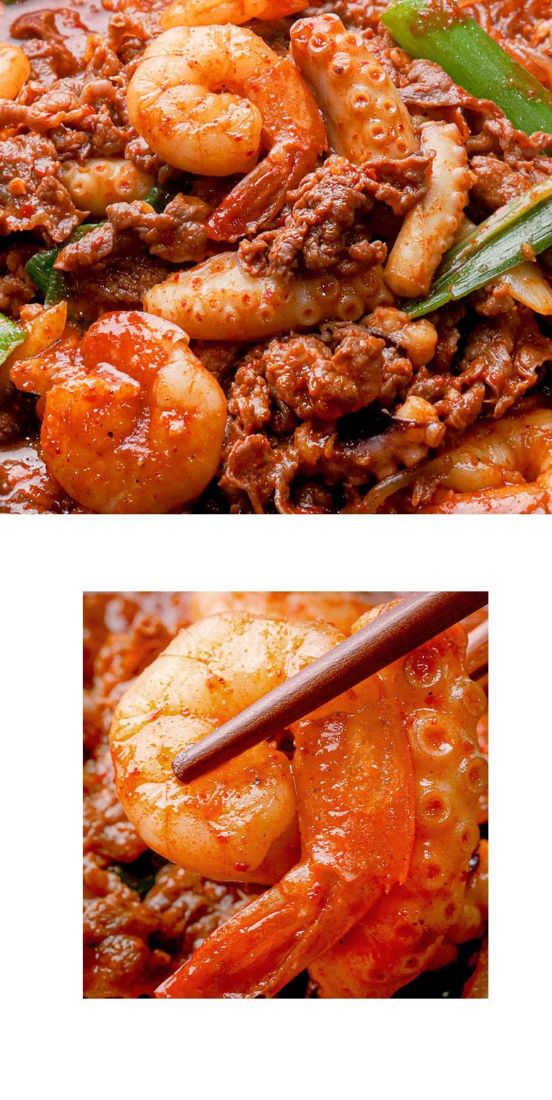 | 포장단위별 내용물의 용량(중량), 수량 | 450g x 3팩 | 원재료명 및 함량 | 소스[정제수, 간마늘(마늘:국산), 갈색설탕, 고추장{고추앙념(중국산/고춧가루)}, 물엿,굵은고춧가루(중국산70%, 국산30%)], 절단낙지(인도네시아), 소고기(국내산/한우목심),흰다리새우살(페루/흰다리새우99.099%, 폴리인산나트륨, 메타인산나트륨, 제삼인산나트륨,메타중아황산나트륨(산화방지제)) |